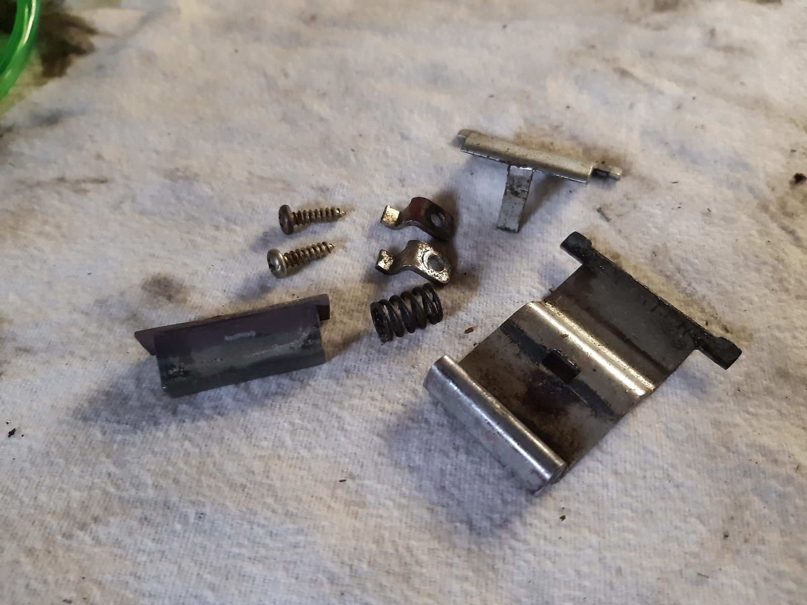 Besteht aus mehreren Teilen (Druckknopf, Blech, Halterungen, Feder...)