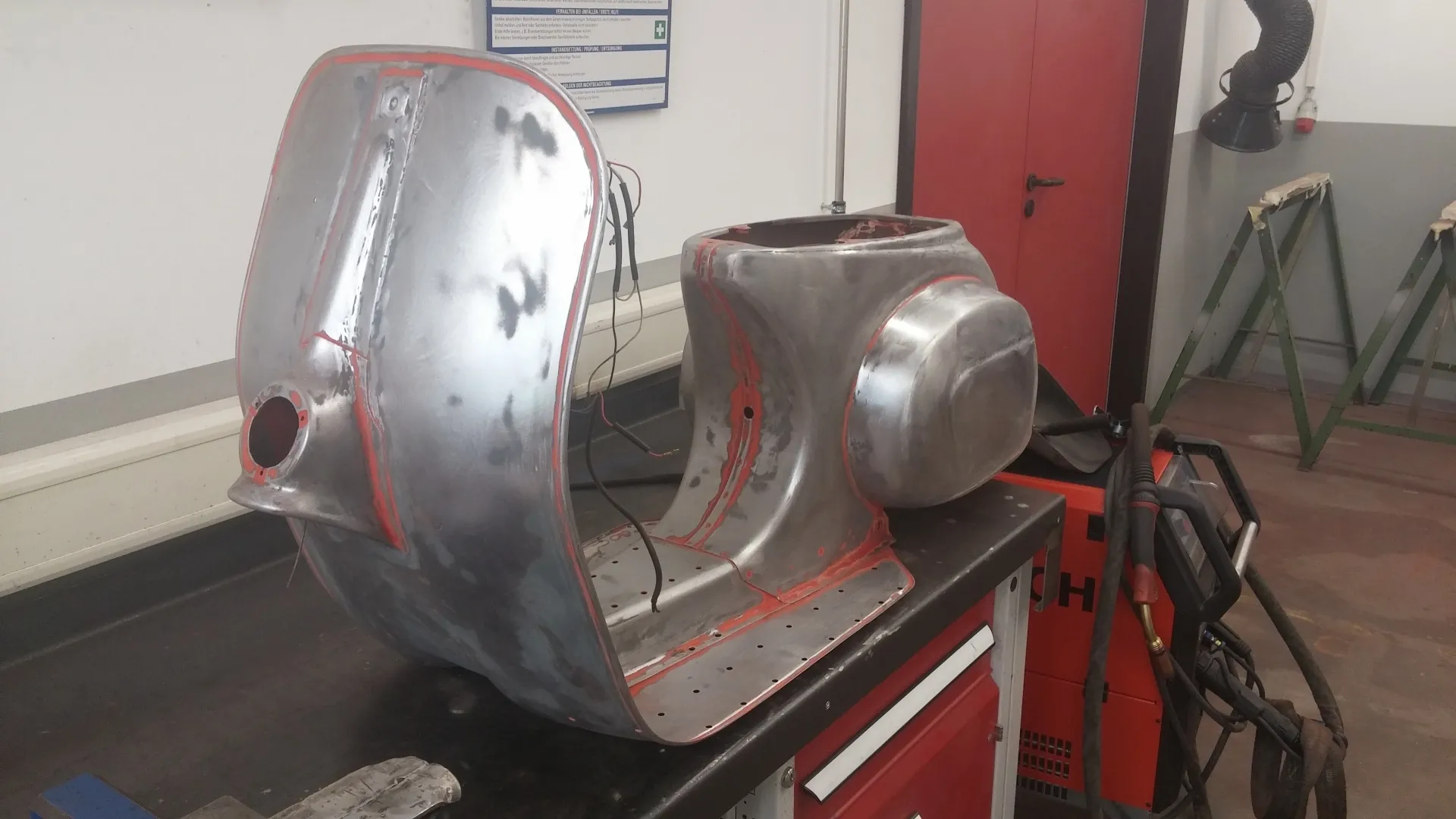 - Der (rostfreie) Rahmen in einer Lackiererei in Heidelberg neu lackiert