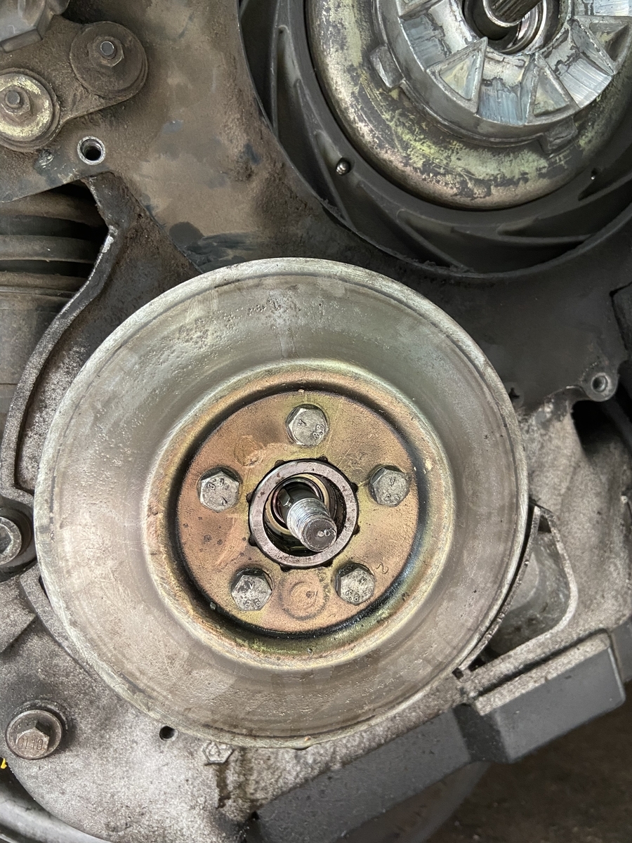 • Untere Riemenscheibe abziehen. Geht manchmal super schwer, da die Kupplung über die Jahre auf der Welle festrottet. Griechfett (Carambe oder ähnliches) wirkt manchmal Wunder. ACHTUNG: Auf der Welle ist ein Keil. Den blos nicht verlieren. Den solltest Du später wieder montieren, damit die äußere Riemenscheibe nicht hohl läuft.
