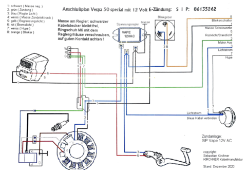 ich habe nach der 12V-Umstellung meiner V50 (V3B3T) Kabelbaum, Schalter und Scheinwerfer getauscht. Die von SIP mitgelieferten Anschlusspläne waren leider nicht korrekt. Leider funktioniert mein Setup immer noch nicht.