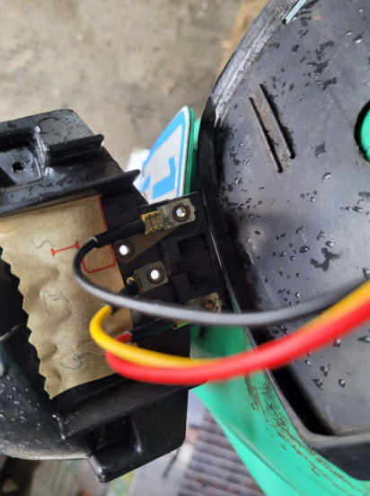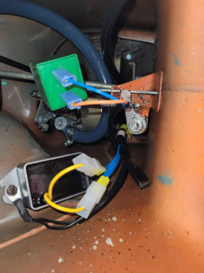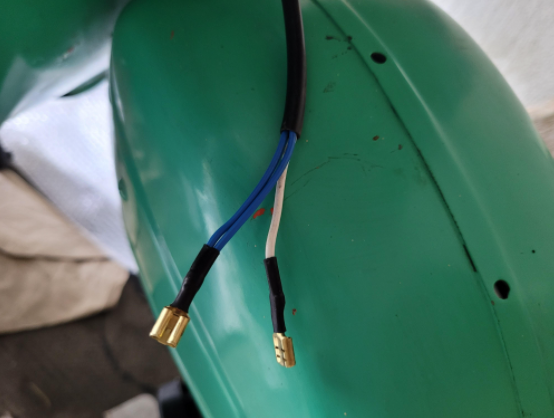 Am Spannungsregler sind die beiden blauen Kabel mit gelbem Stecker angeschlossen, Schwarz am Rahmen.