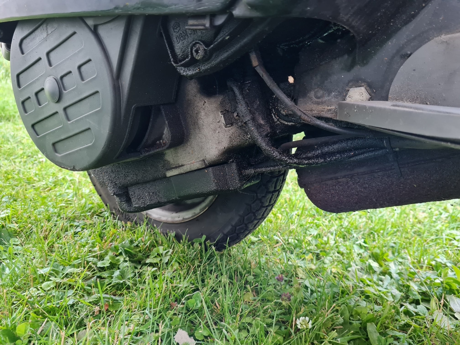Die Batterie ist auf jeden Fall platt und von unten ist sie auch etwas schmierig. Ich weiß nicht, was da ausgelaufen ist. Der Motor und der Vergaser und alles liefen aber zuletzt sehr gut. Papiere konnte ich keine mehr finden, aber mein Vater sucht noch. Einen Schlüssel gibt es natürlich noch.