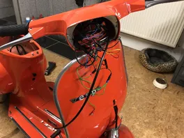 Jetzt noch die provisorischen Kabel von meiner Testverschaltung der Schnarre ohne Einbeziehung des Rücklichts ala Primavera etwas einkürzen, meinen zusätzlichen Kabelbaum in weiß und braun ebenfalls einkürzen und das Ganze verdrahten.