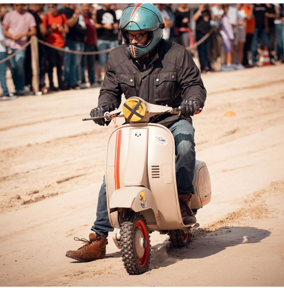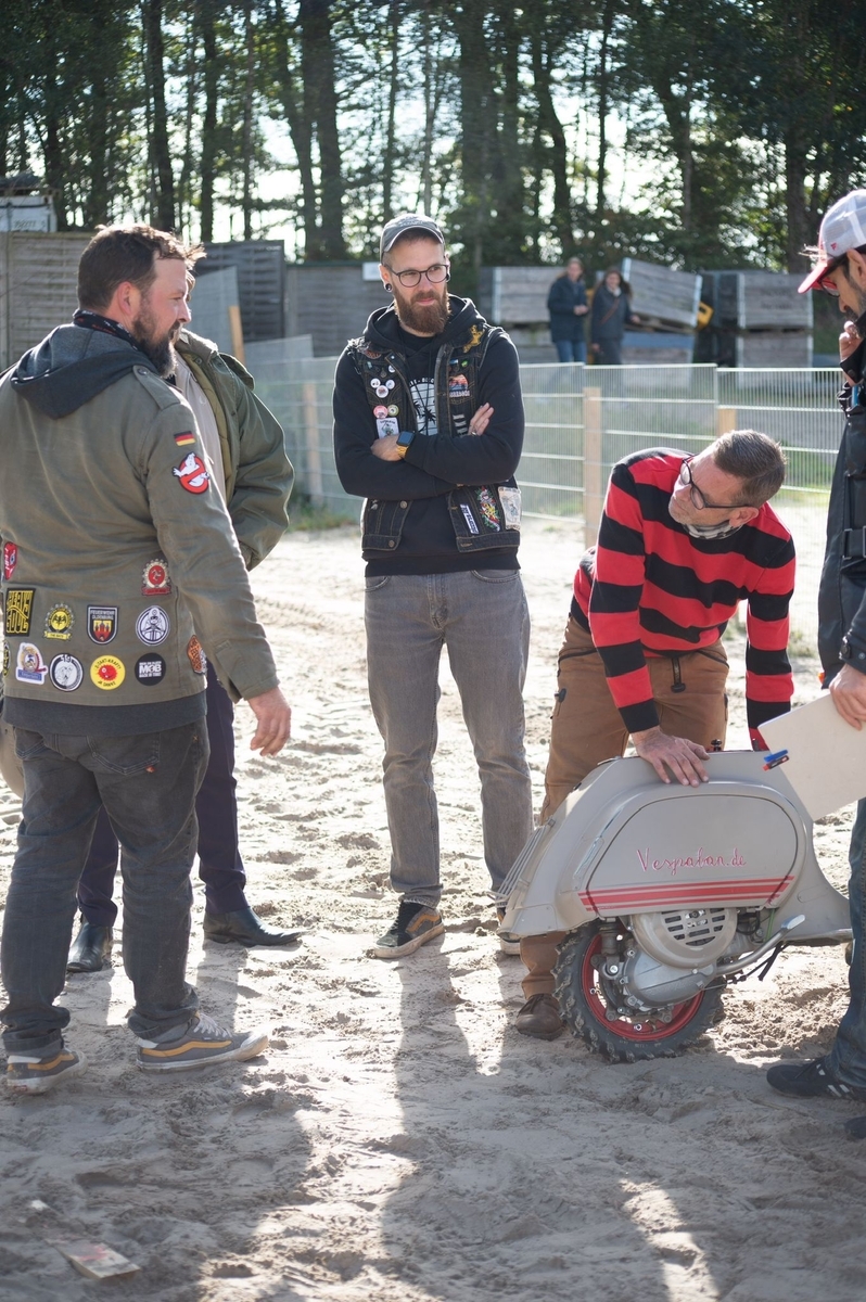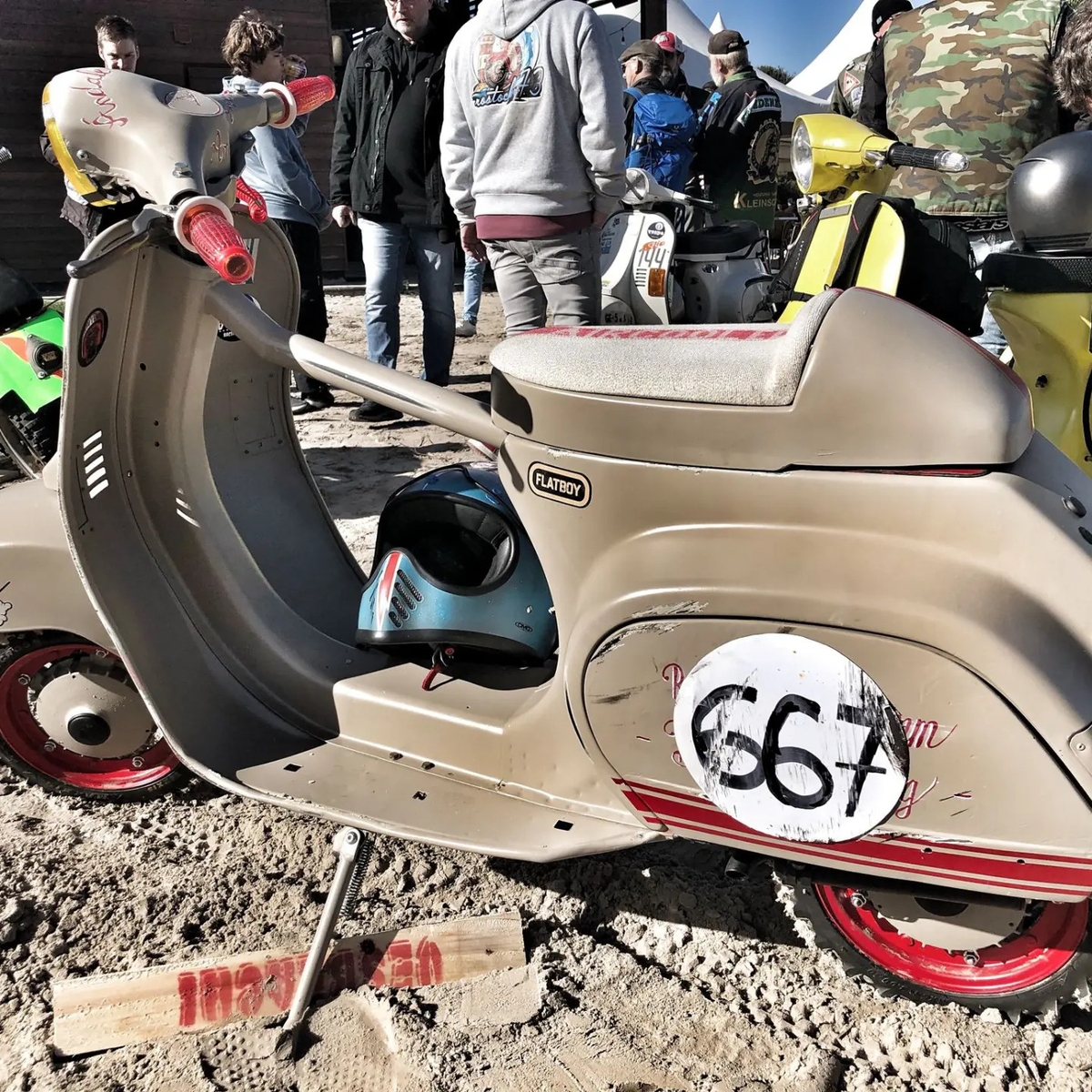 Jetzt, etwas mehr als 2 Jahre nach Baubeginn und dem Einsatz als Flattracker ( mit Regen-Reifen und ohne Vorderradbremse) , dem leider zu kurzen Vergnügen auf dem Harzring (auf ganz frischen Dunlop TT 93 e) und dem Beschleunigungsrennen (wieder Regen-Reifen) hat Jelto vom Strand ein fantastisches Event am Strand unseres lokalen Beachclubs organisiert.
