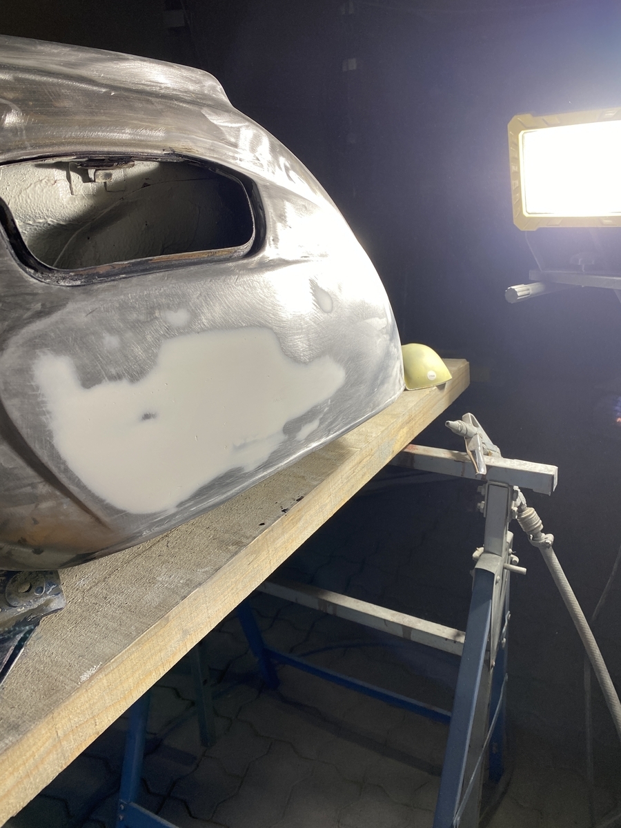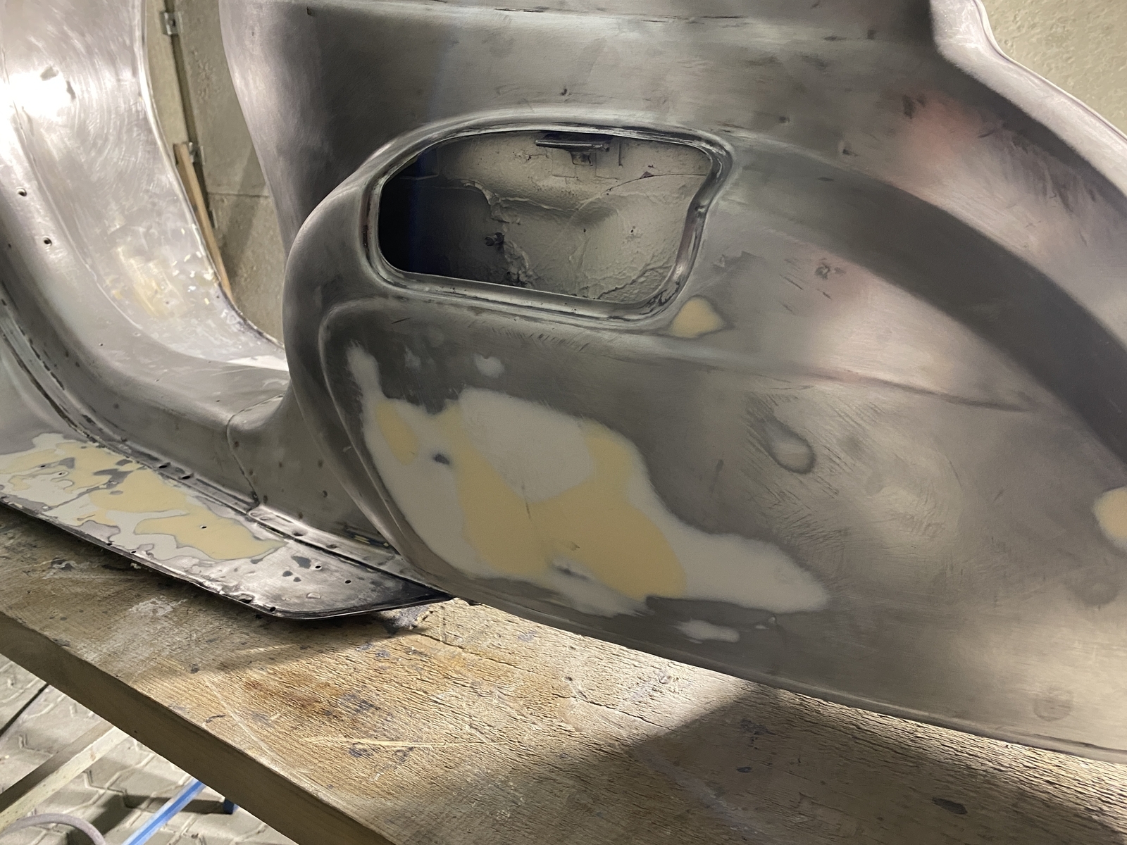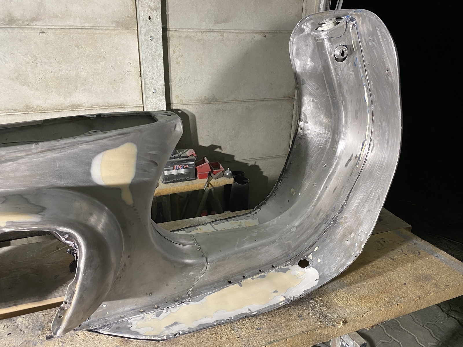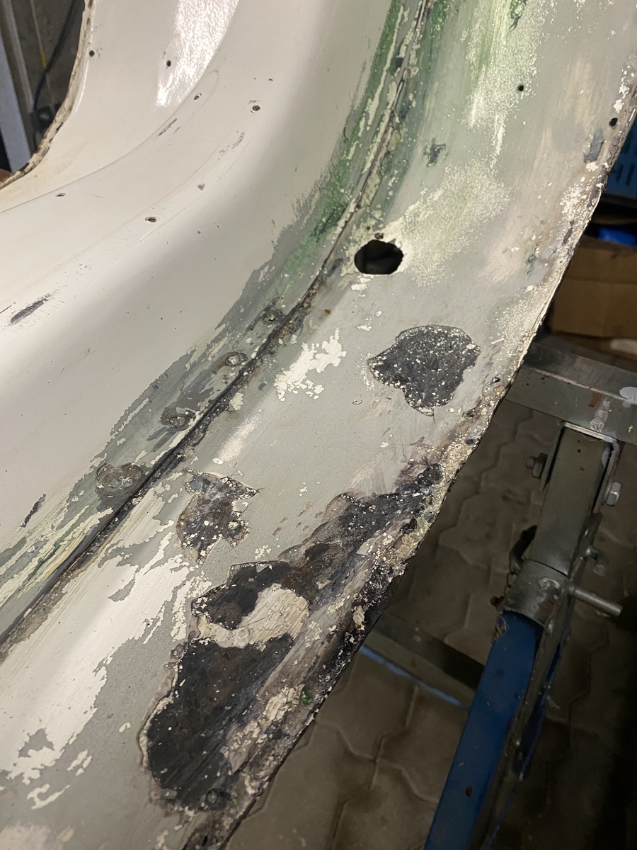 Bin generell mit CSD Scheiben bis auf Blech runter, dann die gröbsten Stellen gespachtelt, eine kleine Stelle am Heckunterteil mit Kaltmetall verschlossen und irgendwann dann gefüllert.
