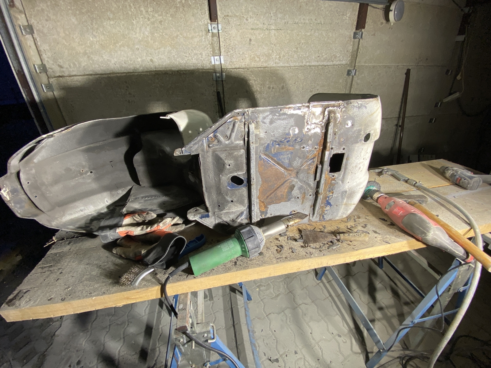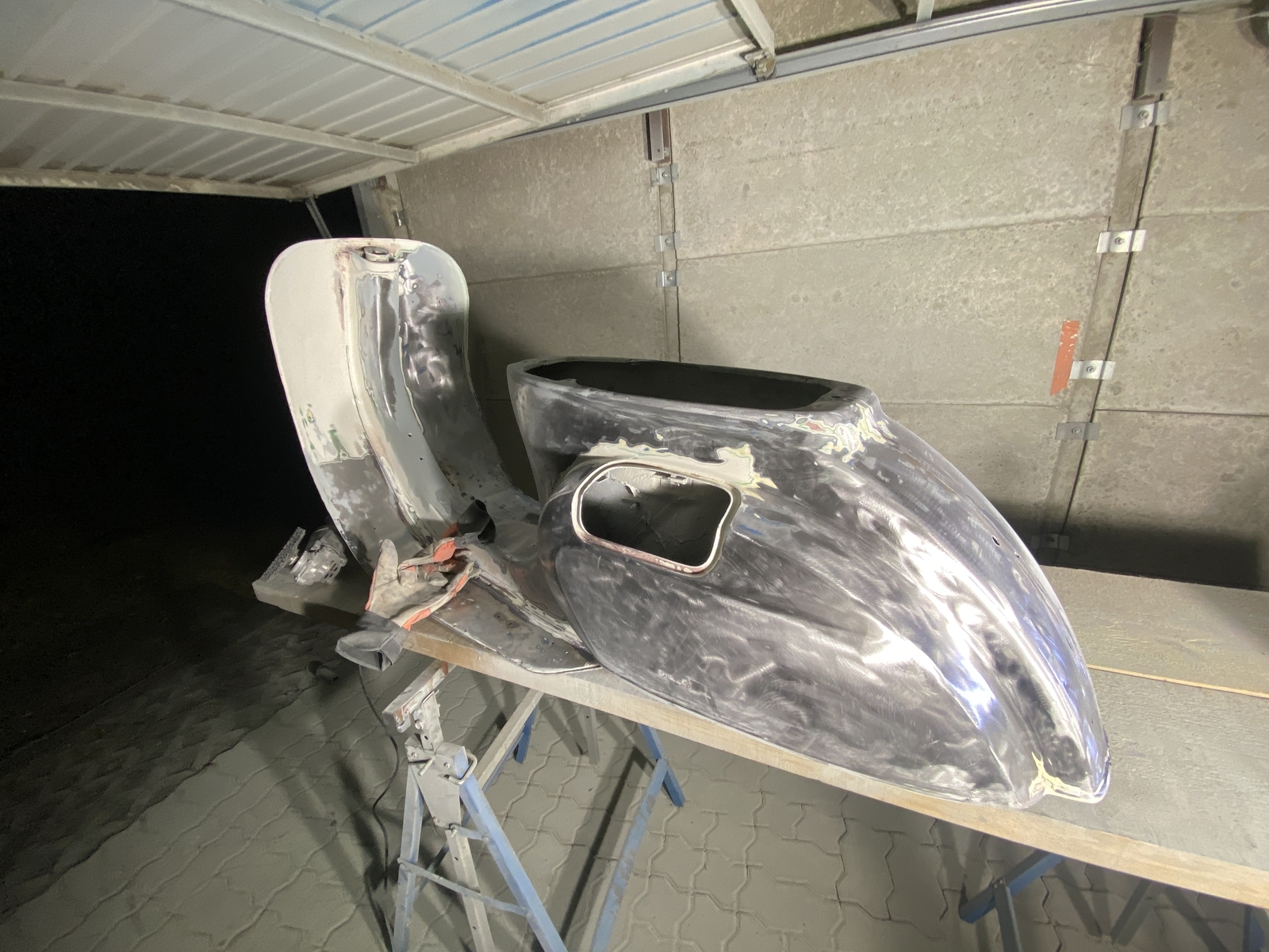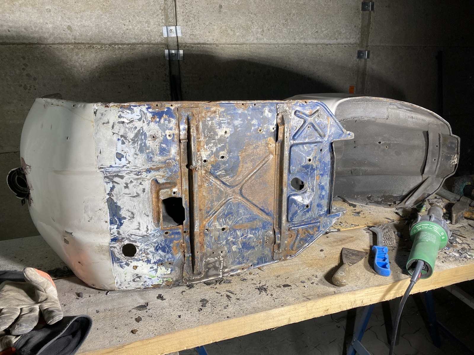 Bin generell mit CSD Scheiben bis auf Blech runter, dann die gröbsten Stellen gespachtelt, eine kleine Stelle am Heckunterteil mit Kaltmetall verschlossen und irgendwann dann gefüllert.
