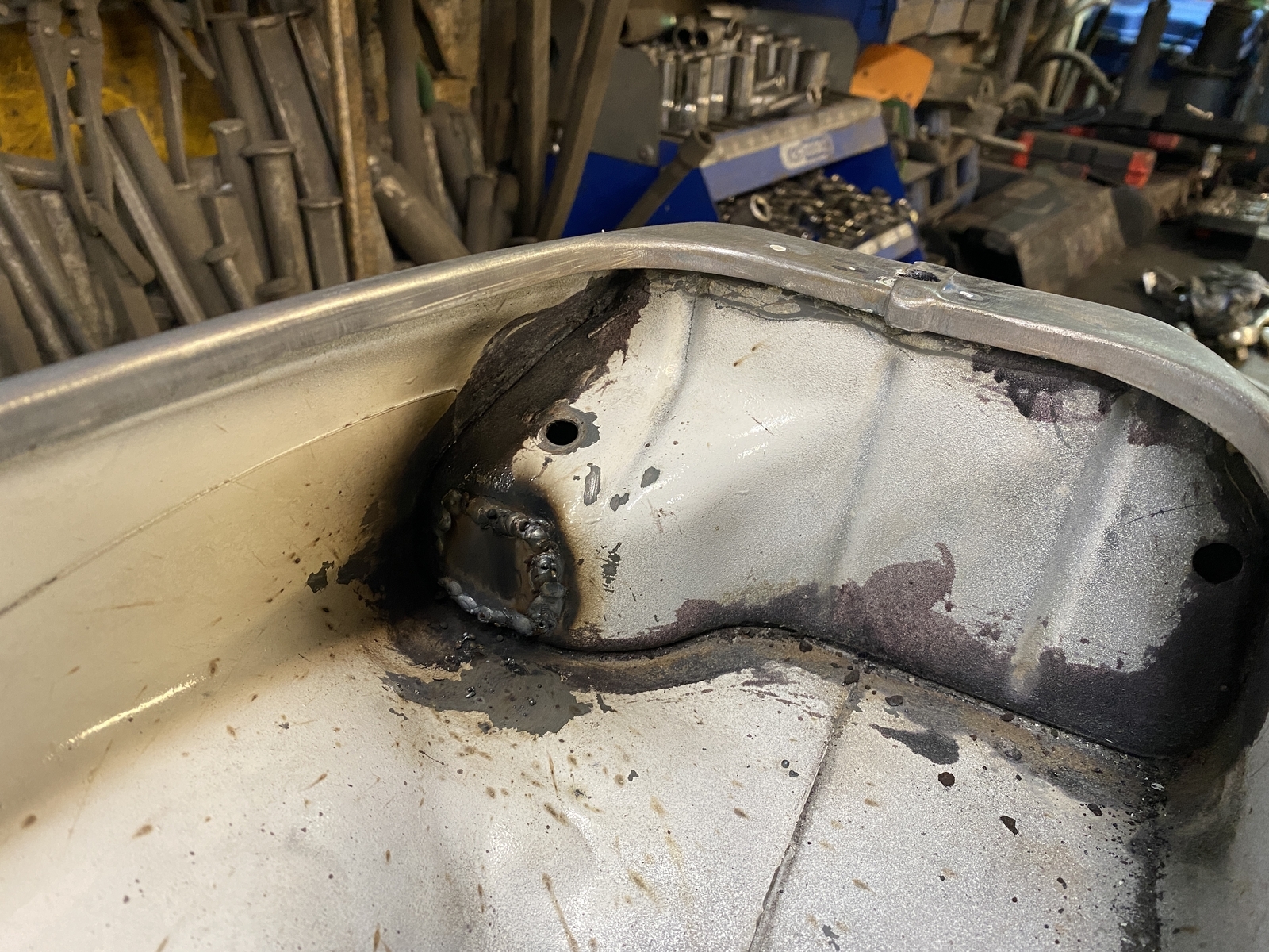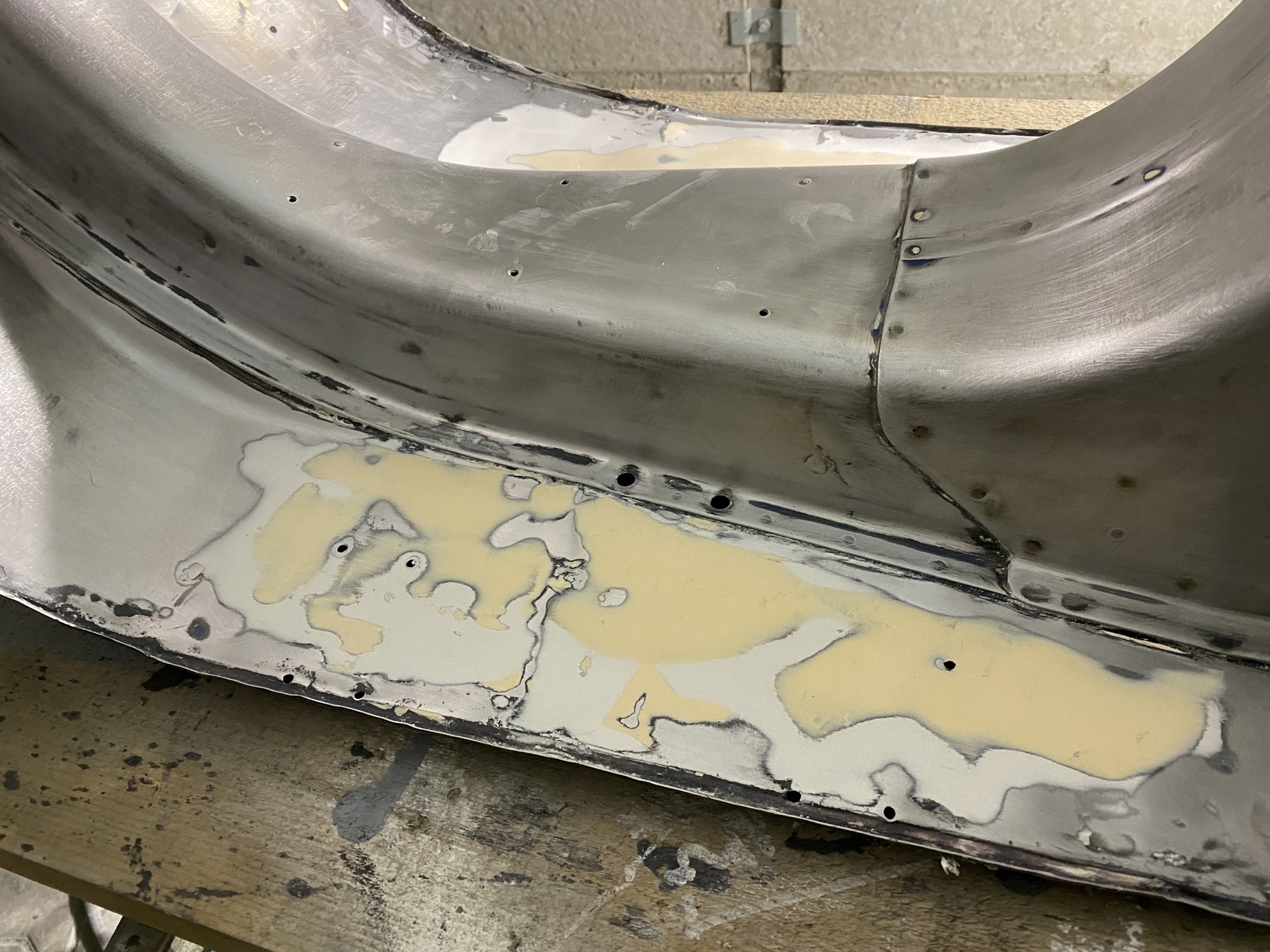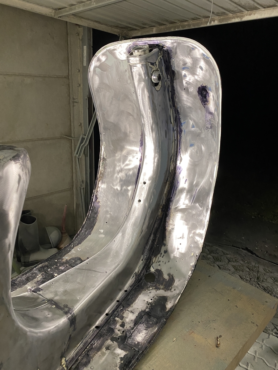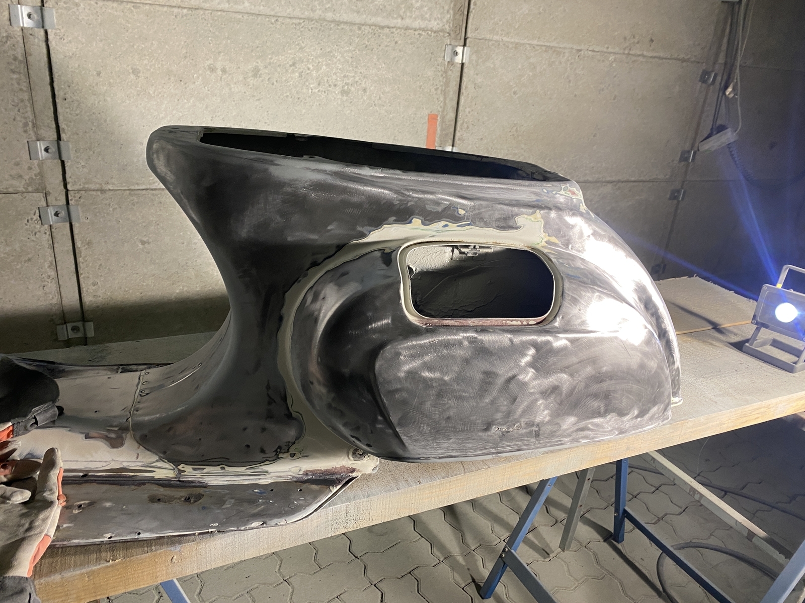 Bin generell mit CSD Scheiben bis auf Blech runter, dann die gröbsten Stellen gespachtelt, eine kleine Stelle am Heckunterteil mit Kaltmetall verschlossen und irgendwann dann gefüllert.