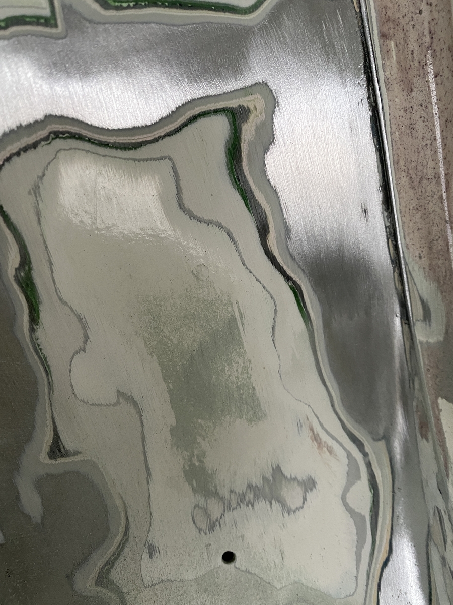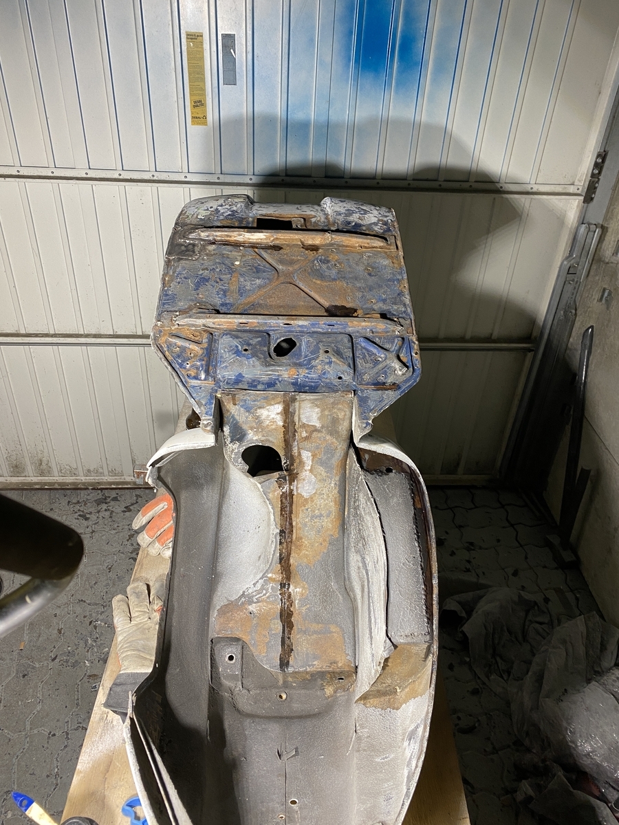 Die Basis der Vespa war "okay"; keine heftigen Durchrostungen, sondern nur viele Jahre "drüberlackiert". Das Beinschild war aber leider schon ziemlich mitgenommen, teilweise 2mm Spachtel, an den Rändern verbeult und die Kanten sehr unregelmäßig. Habe mich dennoch entschieden kein neues Beinschild einzuschweißen, sondern das Alte so gut es geht wieder hinzukriegen und ein paar Spuren einfach zu behalten. Mir gefallen perfekt restaurierte Oldtimer Vespas einfach nicht. Irgendwie passt das nicht zusammen.