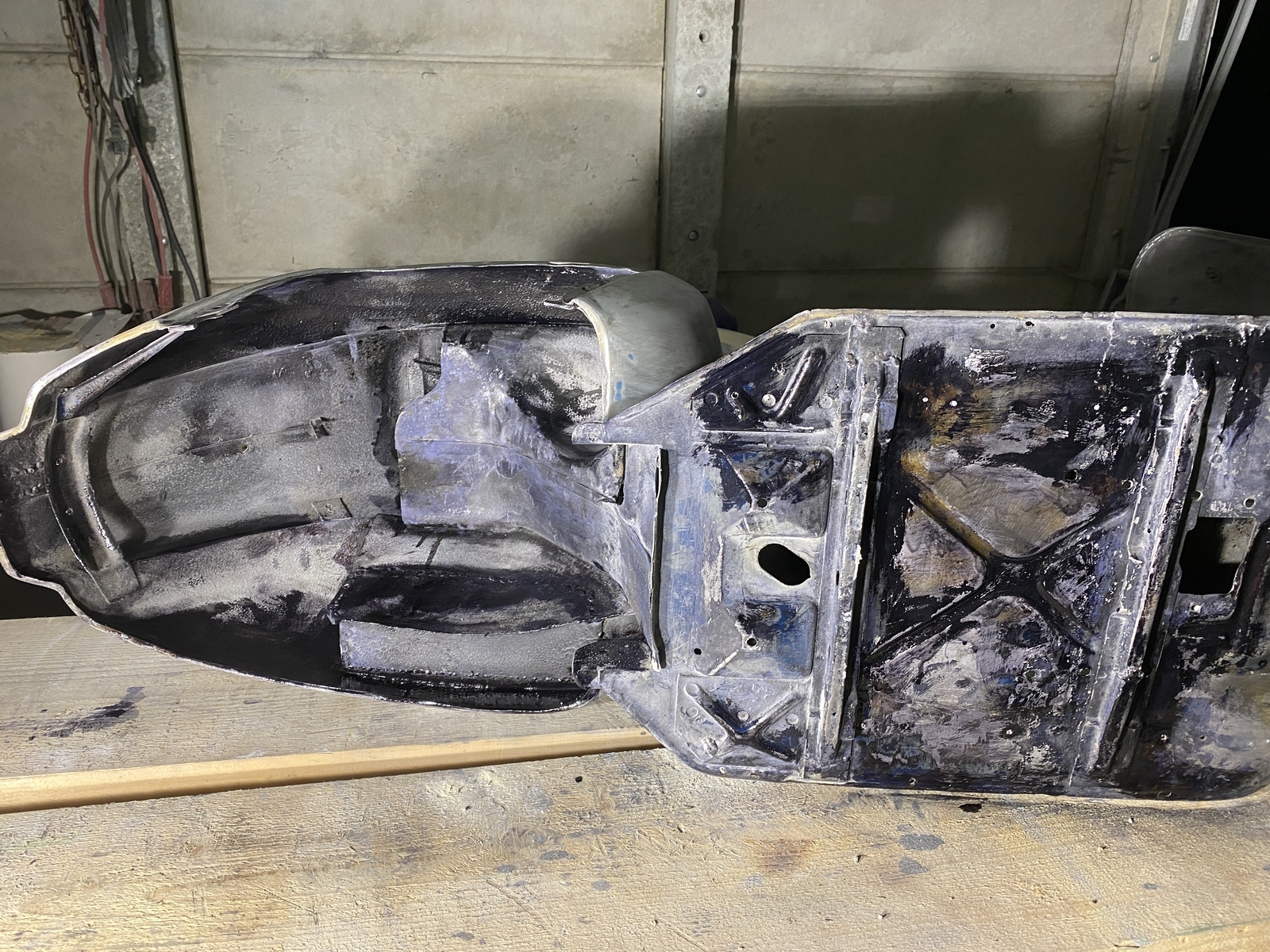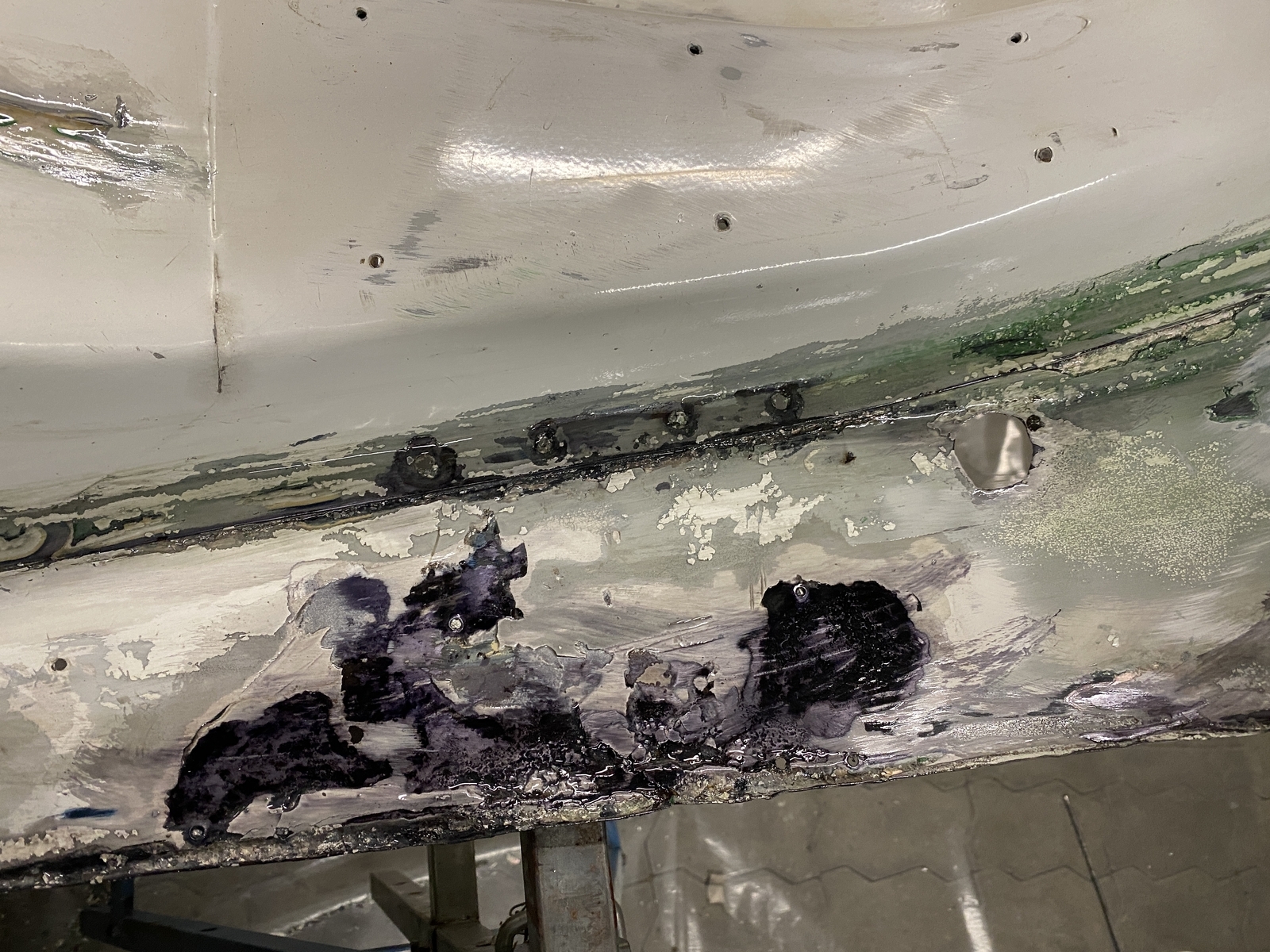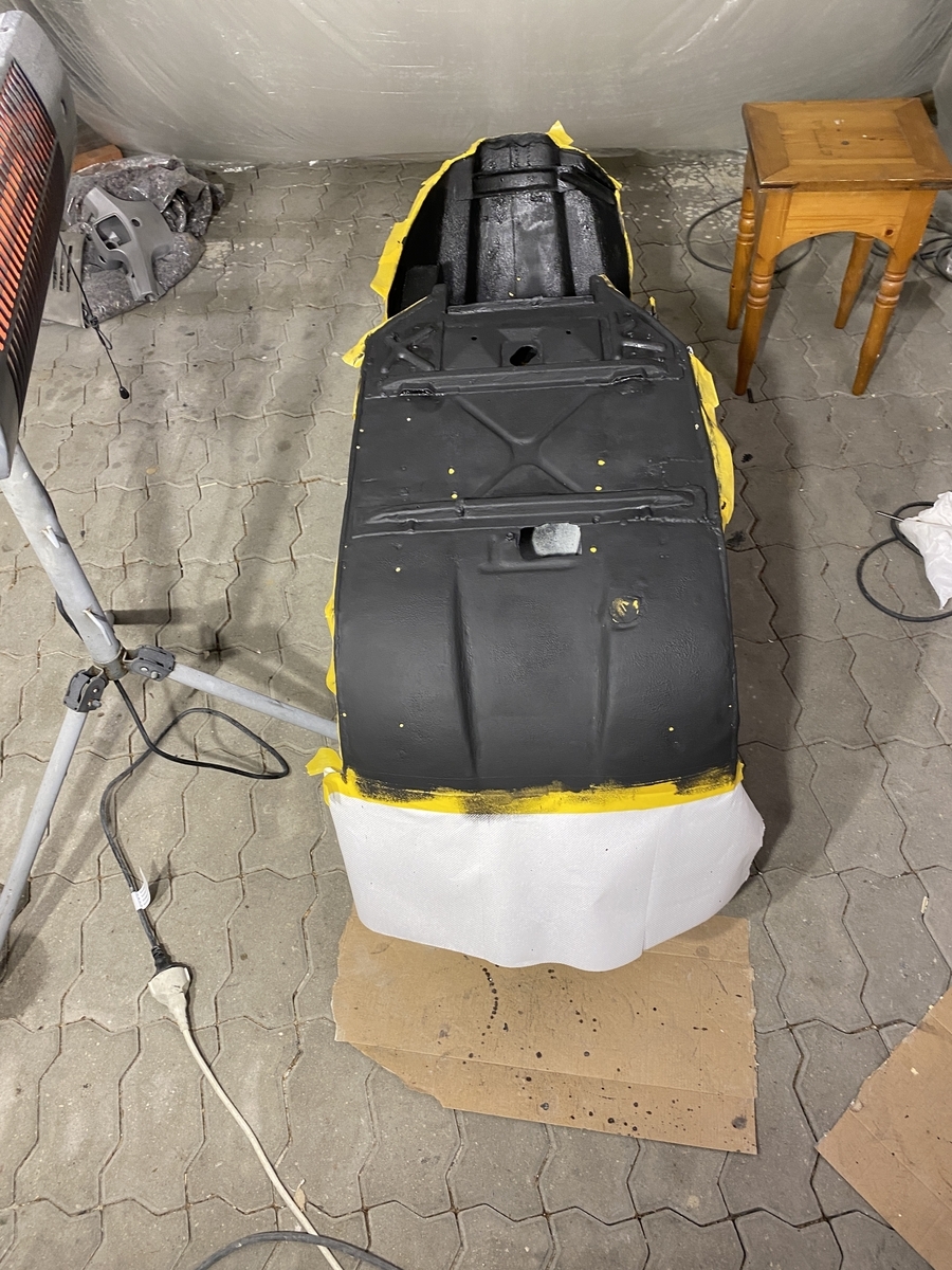Naja viel viele Lackschichten, Rissen im Altlack hatte die Gute ja. Unterbodenschutz hat auch etwas Flugrost freigelegt. Mit Rostumwandler behandelt und nach viel Ablüftung mit überlackierbarem Steinschlagschutz auf Kautschukbasis drüber.