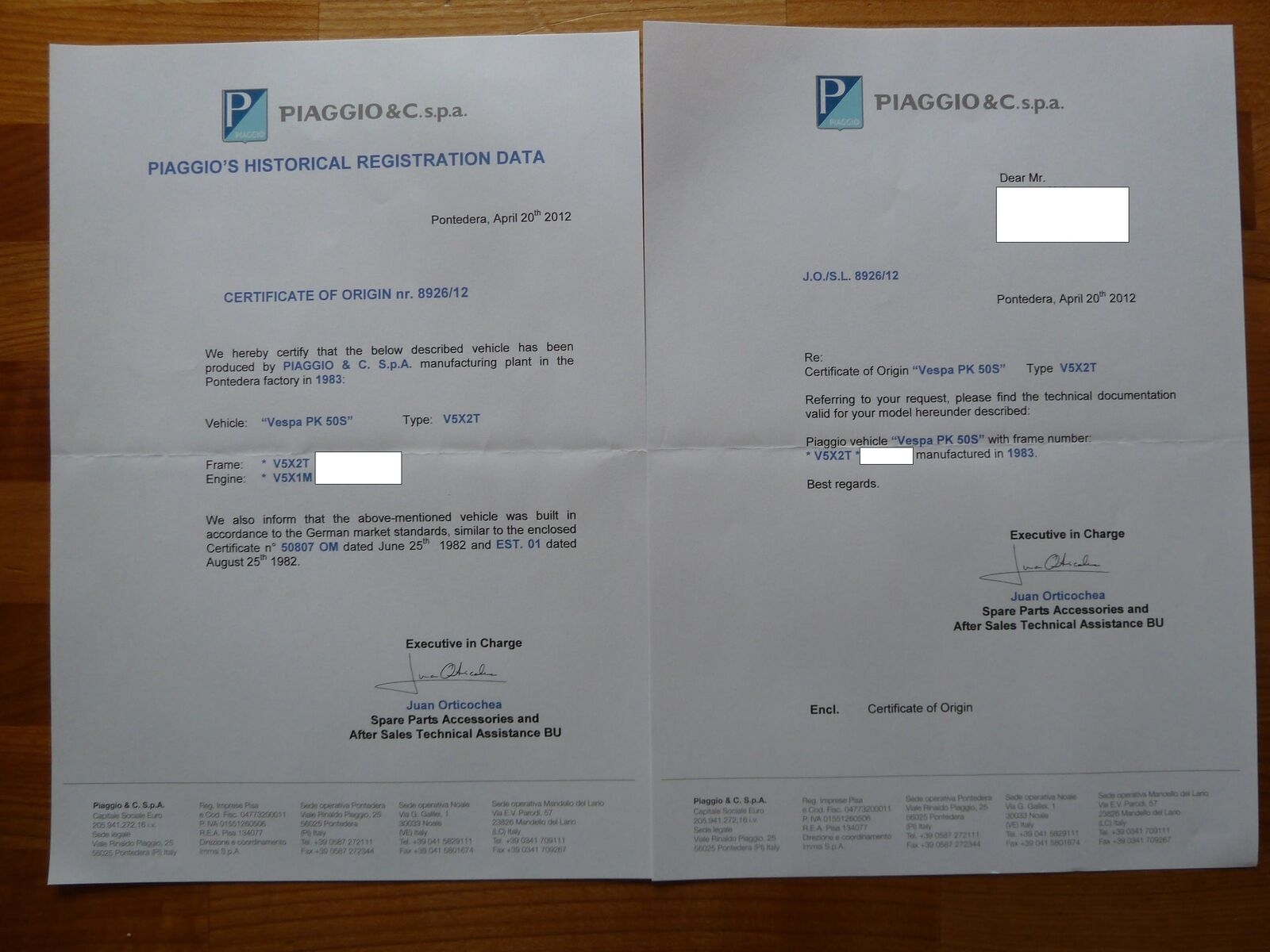 Du bekommst dann einen offiziellen Baujahrsbestätigung von Piaggio - Italien mit Rahmennummer und Motornummer. Kostete vor knapp 10 Jahren € 65.