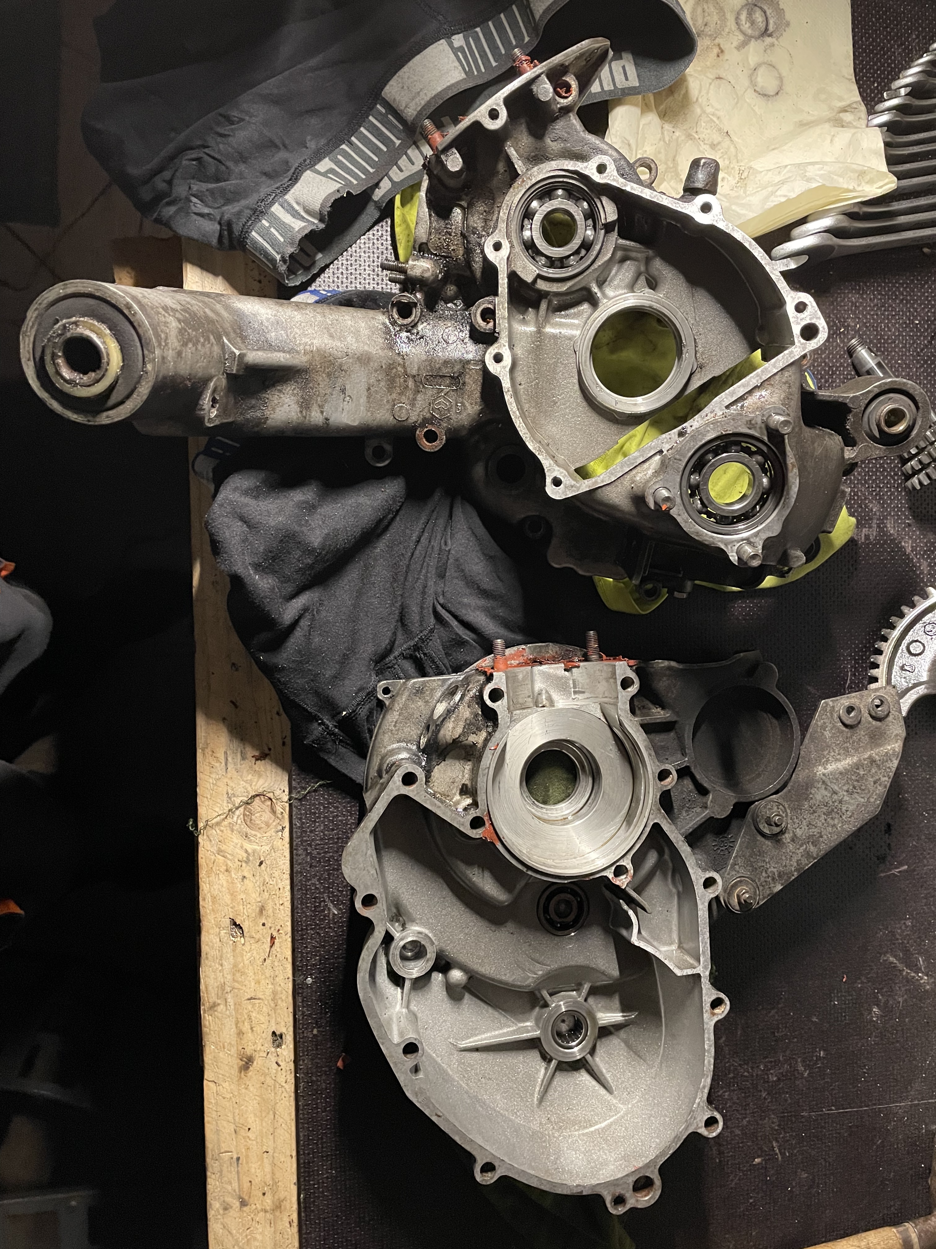 1.) jetzt mal die Motorblockhälften und Anbauteile ordentlich reinigen. Teile sichten und auf Verschleiß prüfen. Lagersitze und Drehschieberflächen kontrollieren.