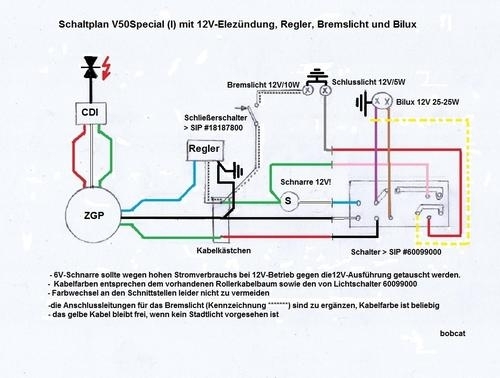 Wie du diese ZGP mit hoher Leistung und Auslegung auf vollständige Gleichrichtung in eine 6V-Anlage der V50 integrieren könntest, kann ich dir leider nicht sagen. Ich gehe aber davon aus, dass das weder mit dem bisherigen Kabelbaum noch den Schaltungen von Bremslicht und Schnarre möglich ist. Ev. brauchst du sogar eine Batterie.