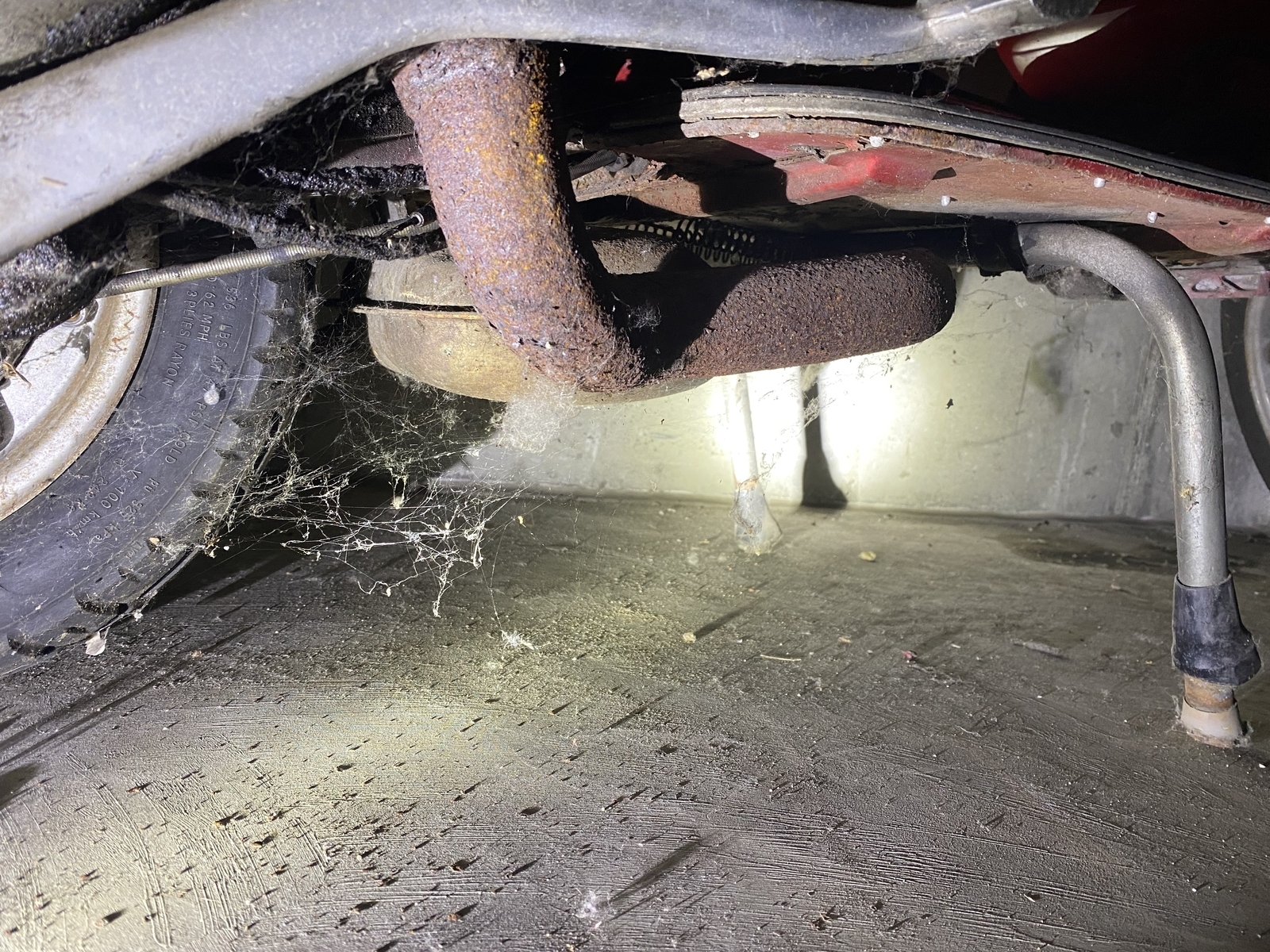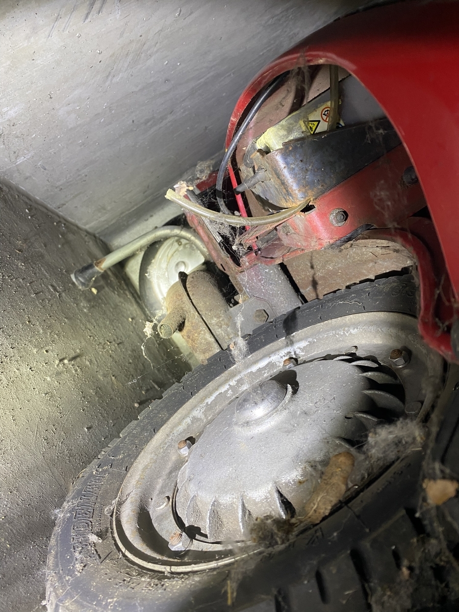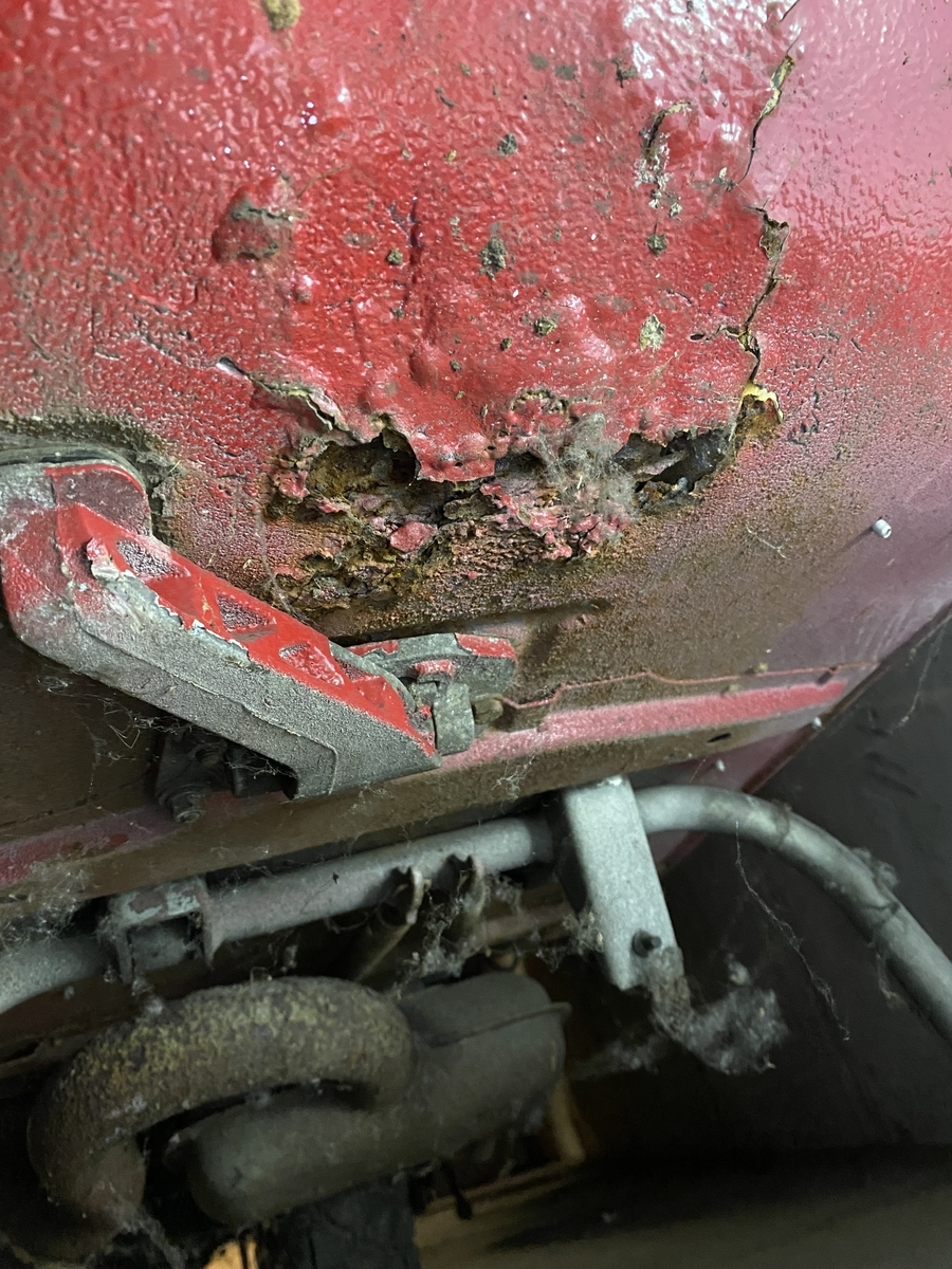 Nun habe ich mir alles soweit als Laie von außen angesehen. Sofort viel mir eine in meinen Augen gewaltige Roststelle am unteren Bereich (Die typische Schwachstelle in Sachen Rost, vor dem Vorderrad) auf, die für mich wohl das KO Kriterium gegen den Kauf dieser Vespa ist.