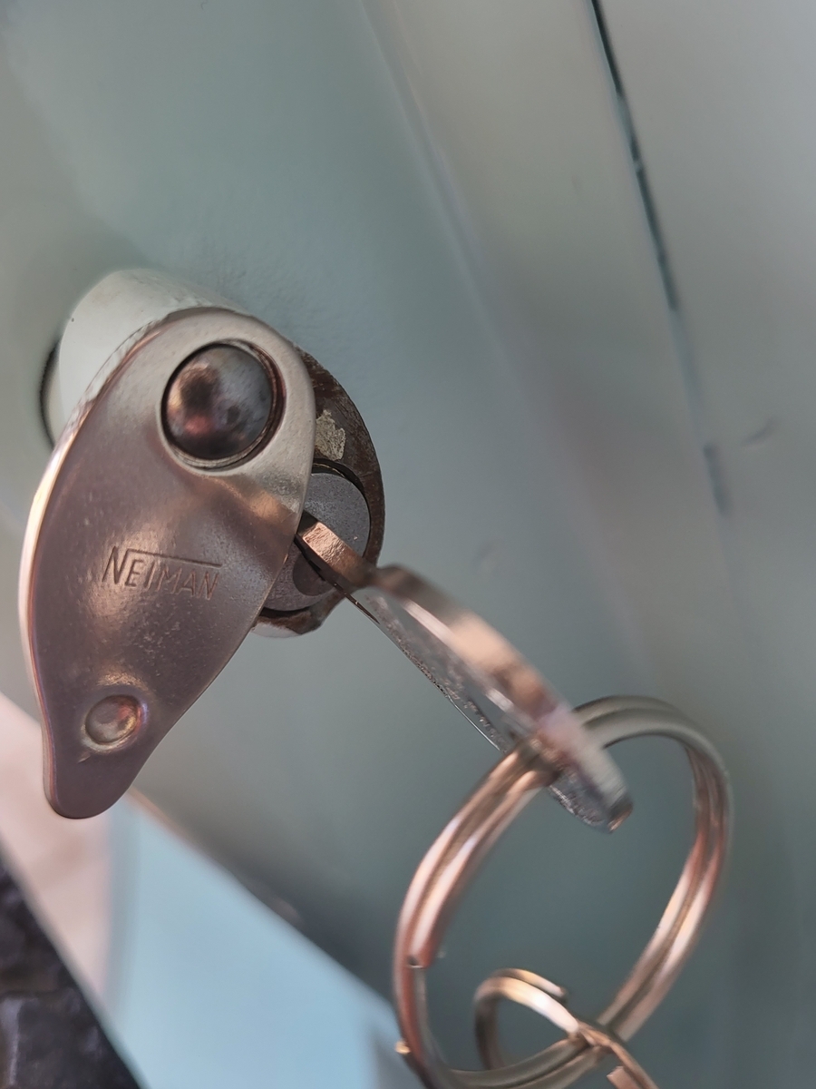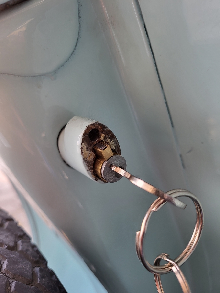 Es zieht sich die Niete mit der Schlossabdeckung raus, da Niete Luft hat, ist aber schon die "dicke/breite"