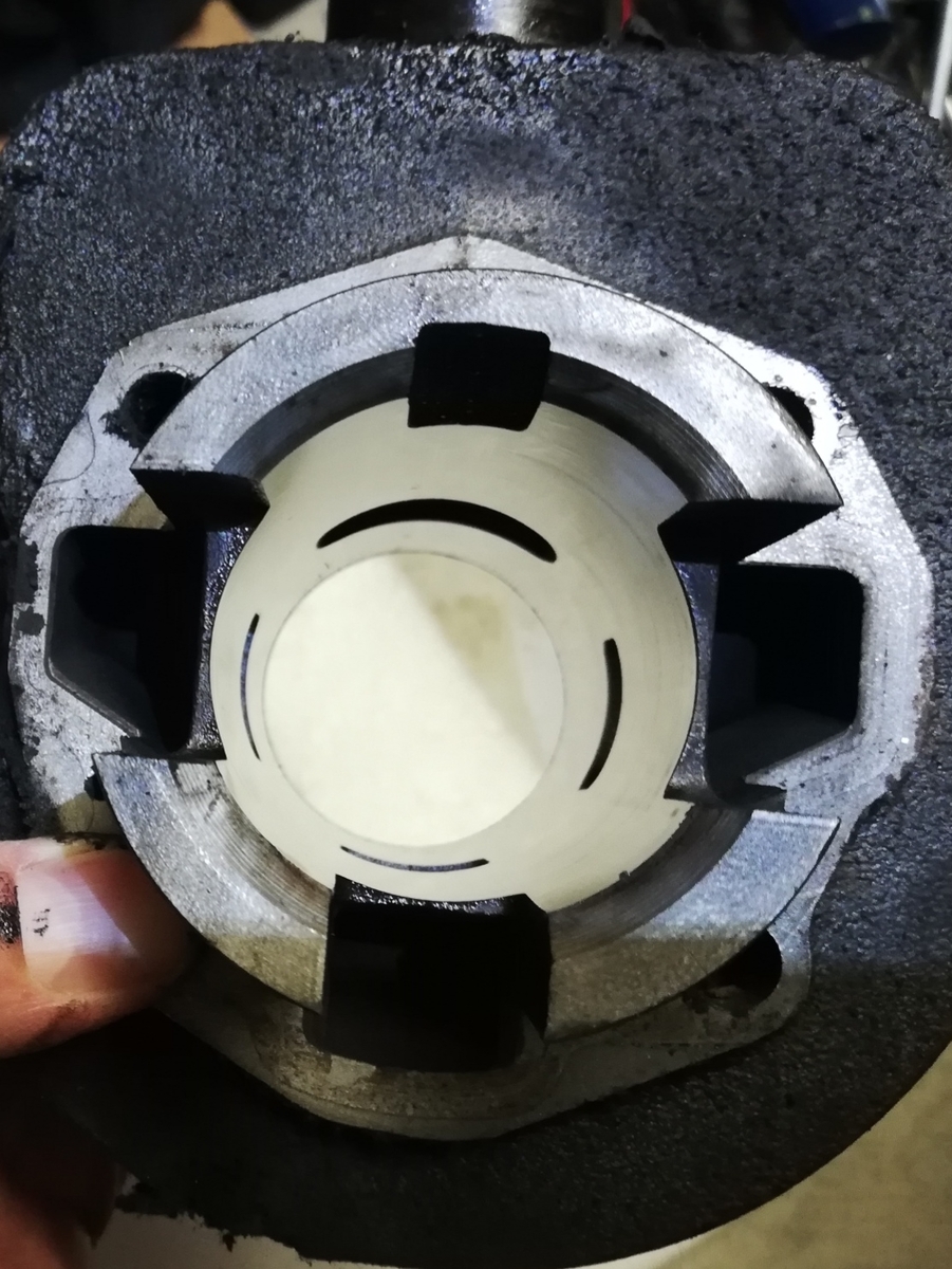 Weil mir auffält, dass du oberhalb des Auslasskanals deutliche Spuren in der Zylinderlaufbahn hast, der Kolben aber viel deutlichere Spuren auf der gegenüberliegenden Seite hat.