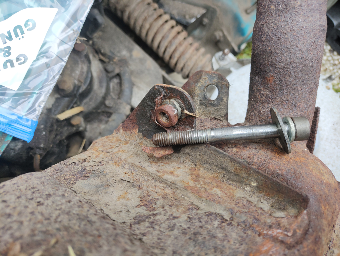 Auspuff raus - check (das hat aber einiges an Zeit gekostet. Zugänglich zum Lösen des Auspuffs war "leider" nur eine innensechskant M6 Schraube. Diese ließ sich aber leider nicht so einfach lösen, da sich die Mutter auf der gegenüberliegenden Seite mit gedreht hat. Wir haben die Mutter dann mit einem Schraubendreher "verkeilt" und haben dann irgenwann die Schraube raus bekommen (siehe Bilder). Die 2 M10 Schrauben ließen sich einfach lösen sind aber irgendwie "rein" gefallen und noch nicht wieder aufgetaucht. Suche geht morgnen weiter.