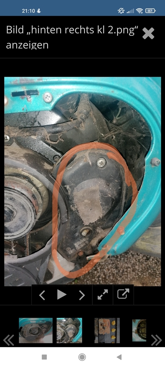 Ok. Deckel (wie markiert) ab, damit wir an den Vergaser kommen. Dann den Benzin-Schlauch ab und schauen, ob Sprit kommt. Wenn Sprit kommt -> Schlauch wieder dran.