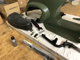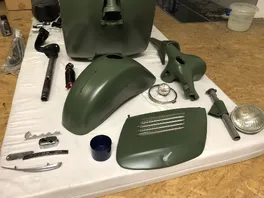 Nun, gestern abend habe ich die Dame abgeholt. Ein paar sehr sauber lackierte Blechteile und kartonweise Teile, alt und neu.