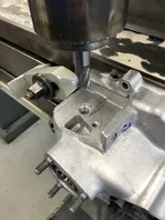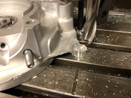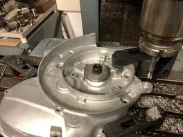 Nach dem Schweißen auf die Maho und von der Polradseite eben gefräst, mit einer neuen Lüferabdeckungen die Bohrungen angezeichnet, das Auge ebenfals angezeichnet und grob weggeräumt und dann 5er Bohrung und das M6 zweimal: