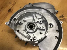 Nun, die fehlende Ecke muß man mal schauen, das wäre kein Beinbruch. Da haut nicht viel Kühlluft ab, aber das abgebrochene Schraubauge für die Polradabdeckung muß ich richten.