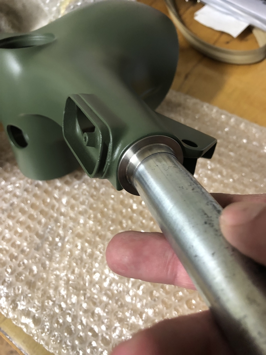 Durch die Ausnehmung kann ich den Lenker spannen mit der Ori-Lenkerschraube, die Kunststoffscheibe ist der Tiefenanschlag und schon gleichzeitig den Lack.