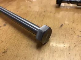 Also mal kurz einen etwas zu langen Rohling aus VA gezwirbelt, um das Gewindeende unter Berücksichtigung von der Dicke von zwei Unterlagscheiben ebenfalls aus VA anzuzeichnen, damit ich den Bolzen fertig drehen kann: