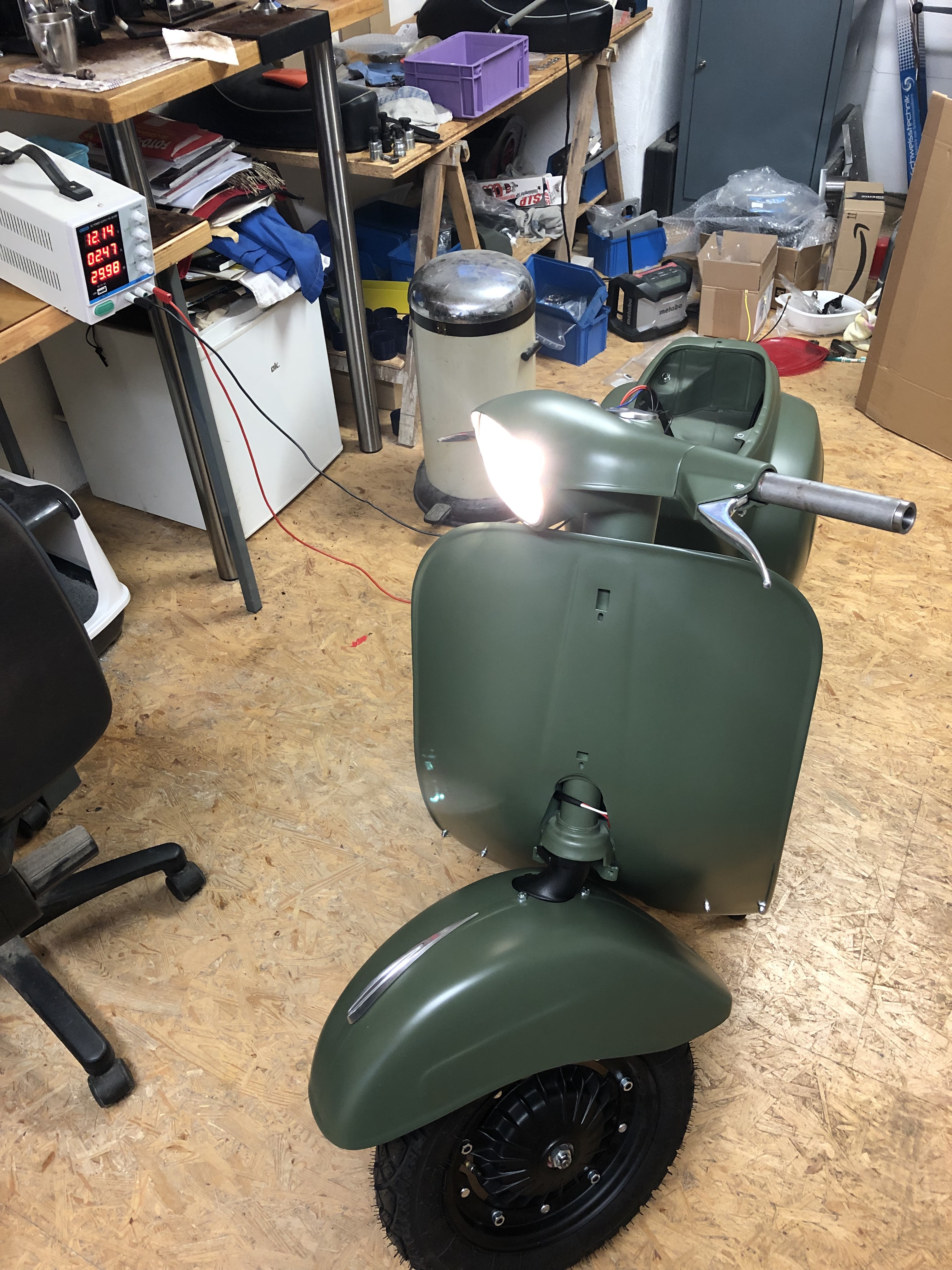 Schön so eine Gleichspannungselektrik, die kann man mit dem Labornetzteil durchchecken, das geht ja mit der Ori einer alten V50 nicht mit ihrer eigenwilligen Verschaltung (Licht aus durch Kurzschließen der Erregerspule...).