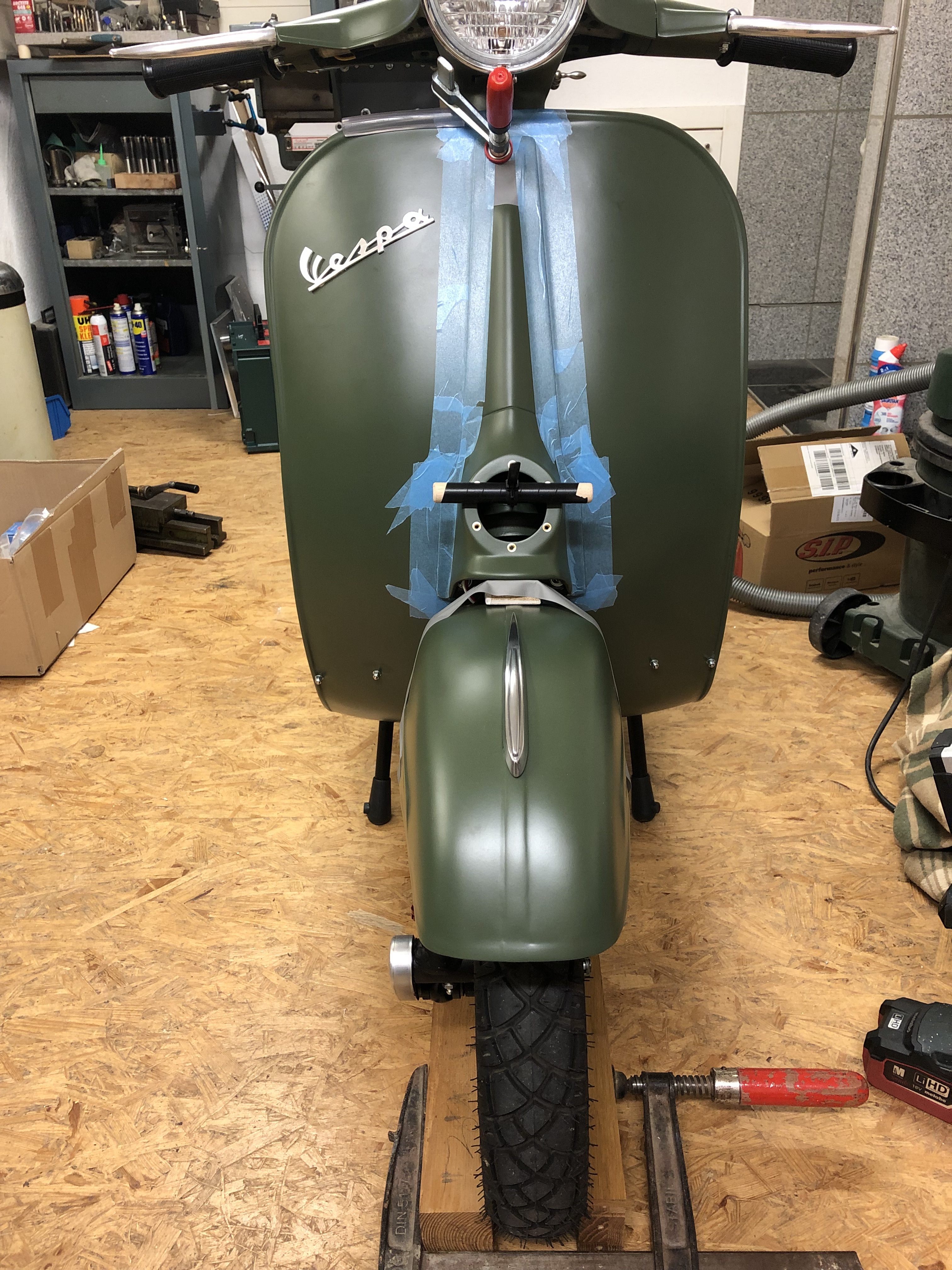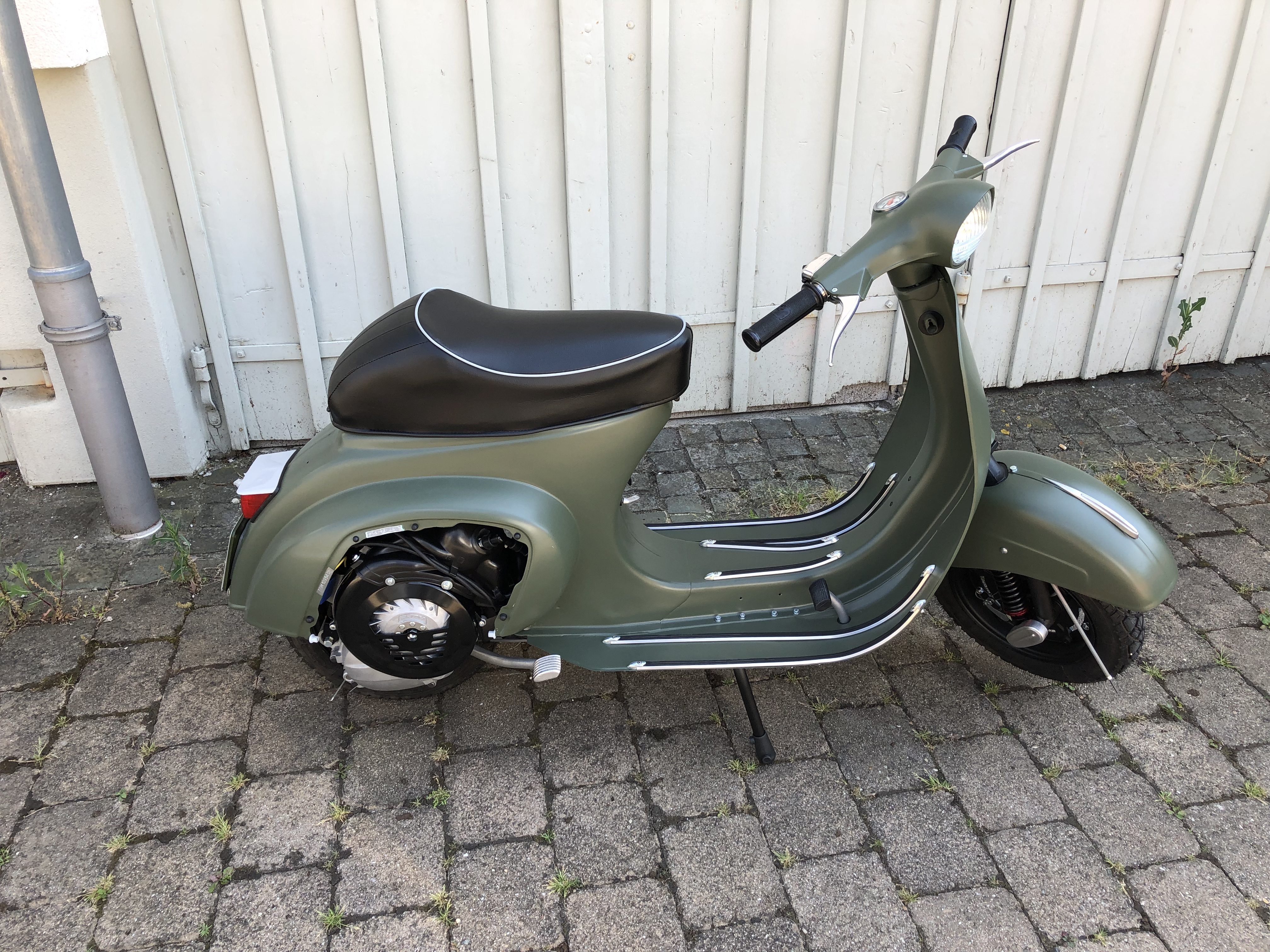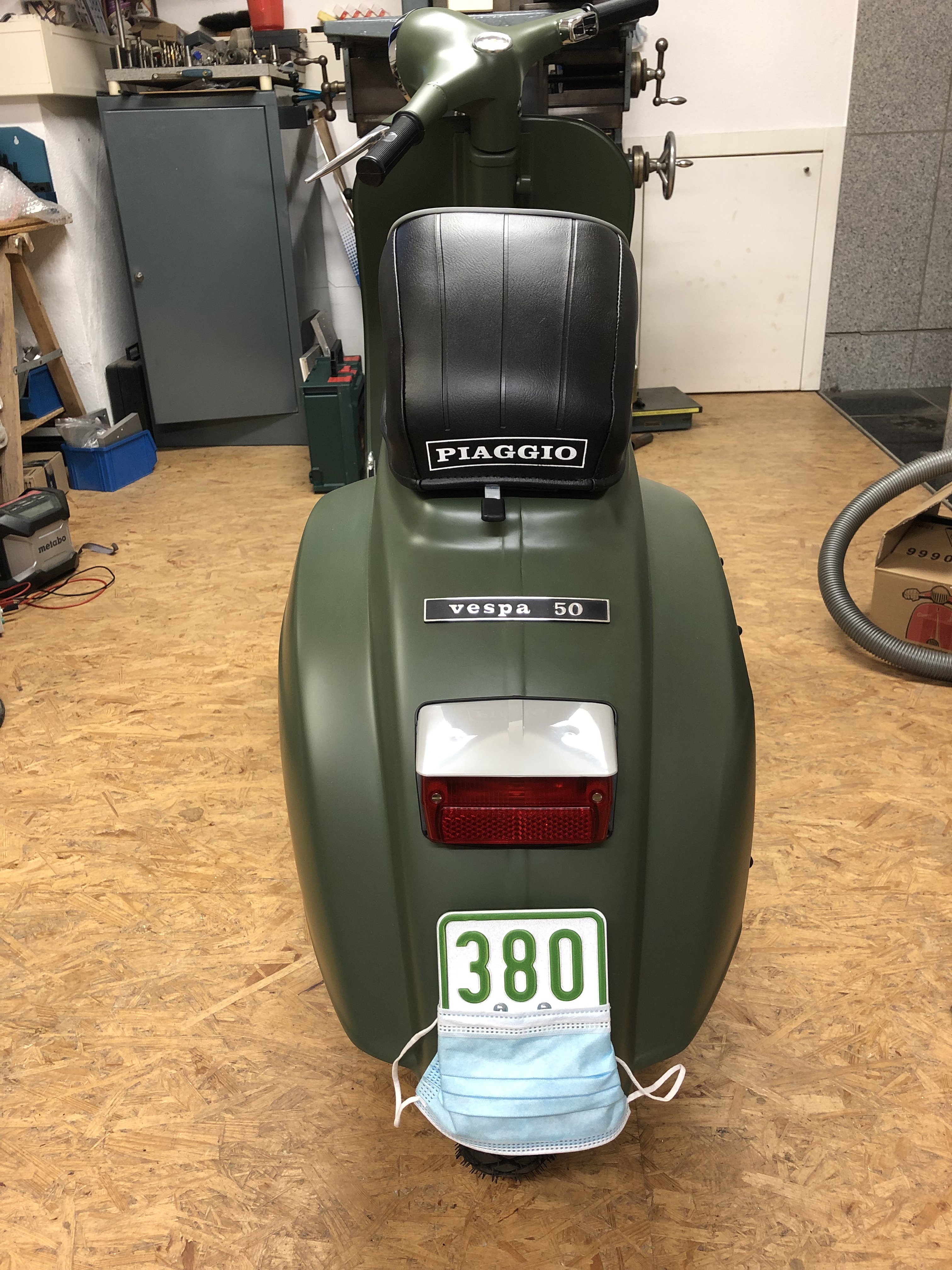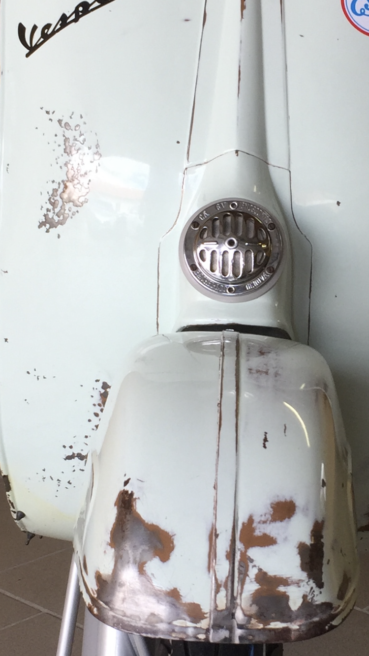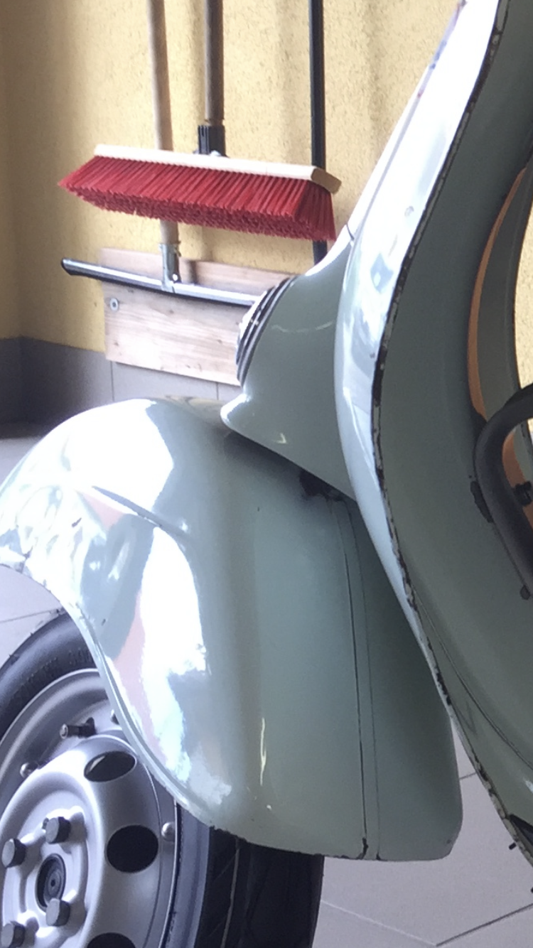 Gestern habe ich noch Sikaflex irgendwas bestellt, dann kann ich das Schild mit ein zwei Punkten fixieren. Vorne fehlt ja auch noch der Vespa-Schriftzug.