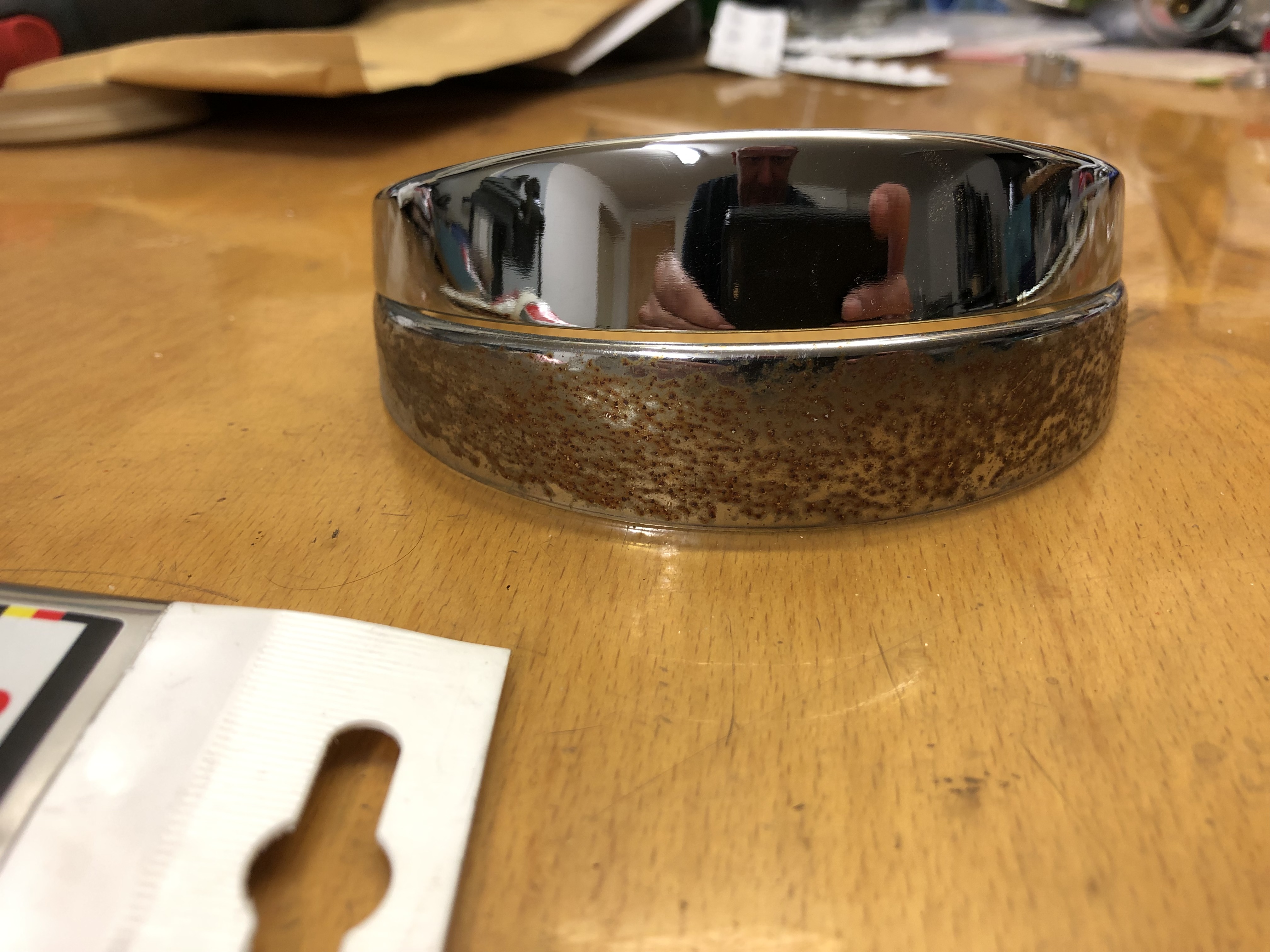 Zurück wollte ich nicht mehr viel machen. Ich habe mir den alten Lampenzierring vorgenommen, um ihn vom Rost zu befreien. Der ist nämlich innen viel glatter wie der Neue und hat keine scharfen Kanten, die den Lacker zerkratzen.