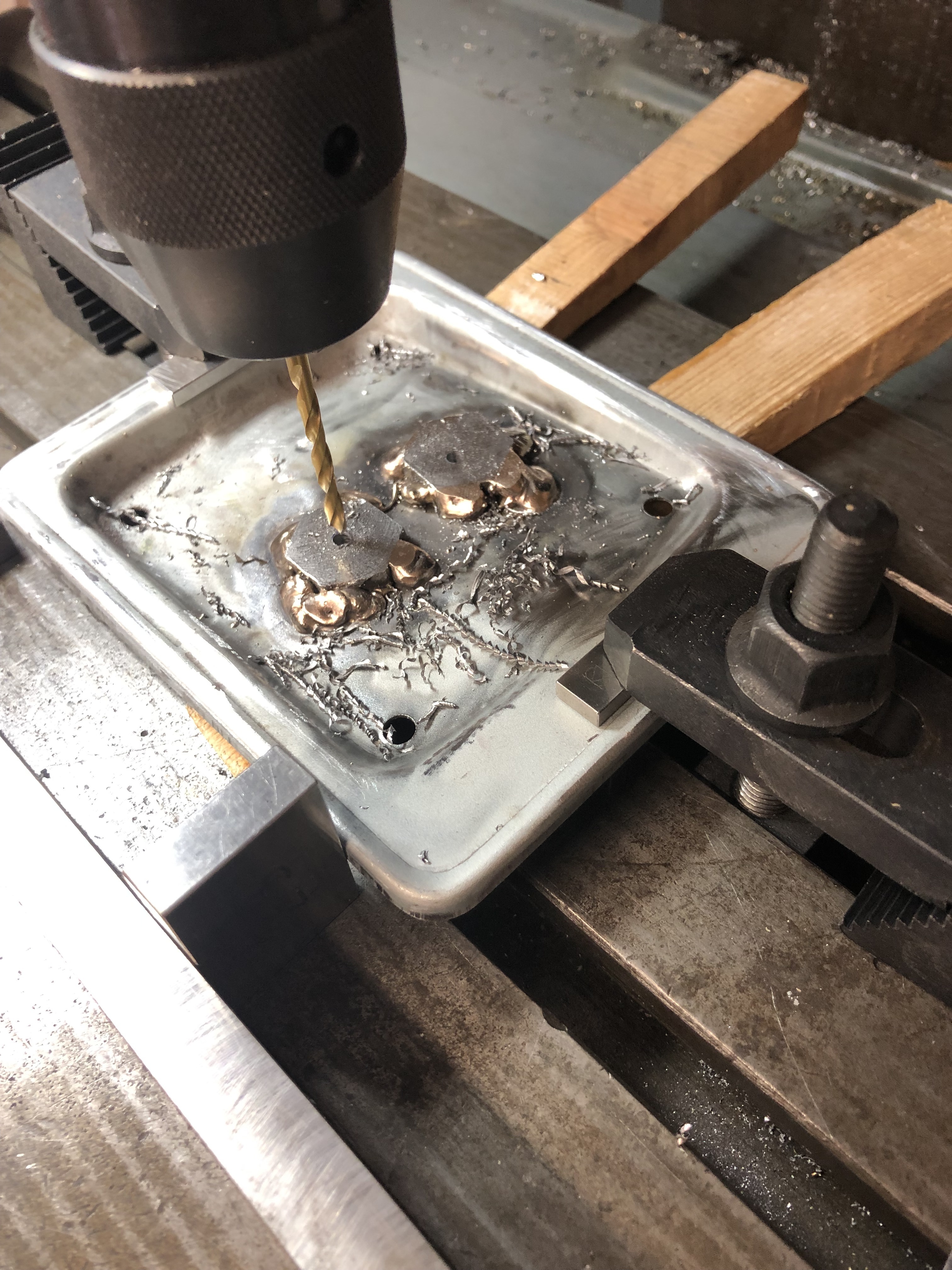 Dann die Kaskade vorsichtig abgebohrt. Nach der ersten Bohrung mit einer Schraube fixiert, dann mit zwei und dann fertig gebohrt: