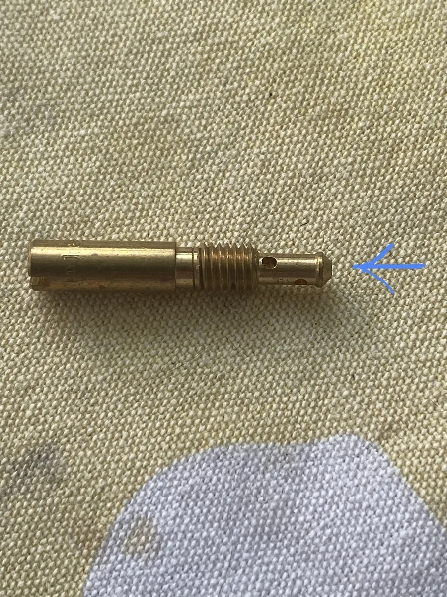 Also Vergaser saubermachen, bei der oben beschriebenen Arbeit könnte ja Schmutz ins Kraftstoffsystem gelangt sein. Bei der Leerlaufdüse 45/140 ist am unteren Ende, wo die Düse etwas konisch ist, eine (verstopfte?) Bohrung längs zur Mittelachse.