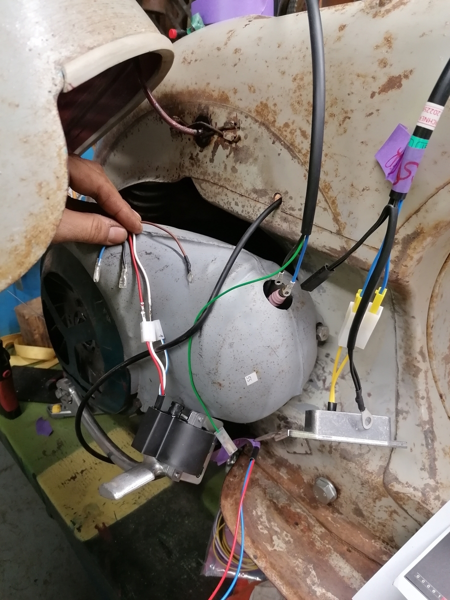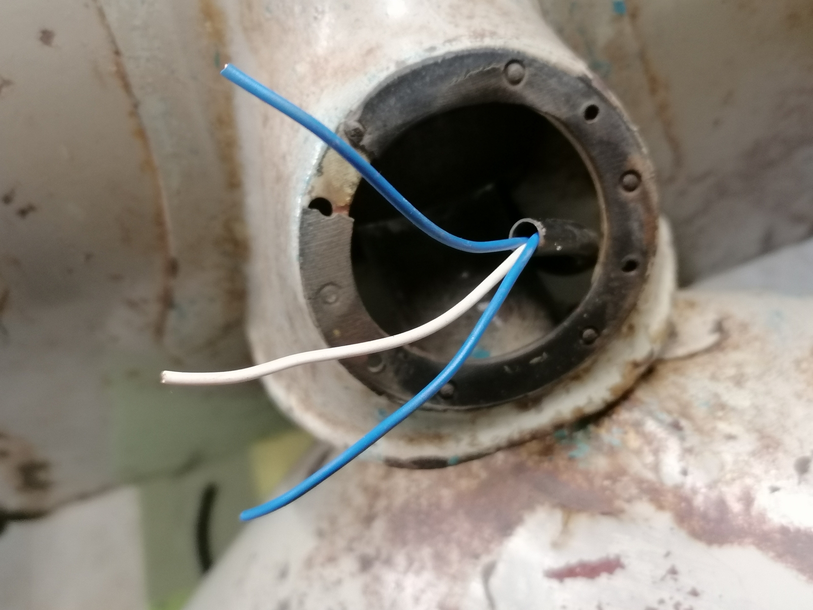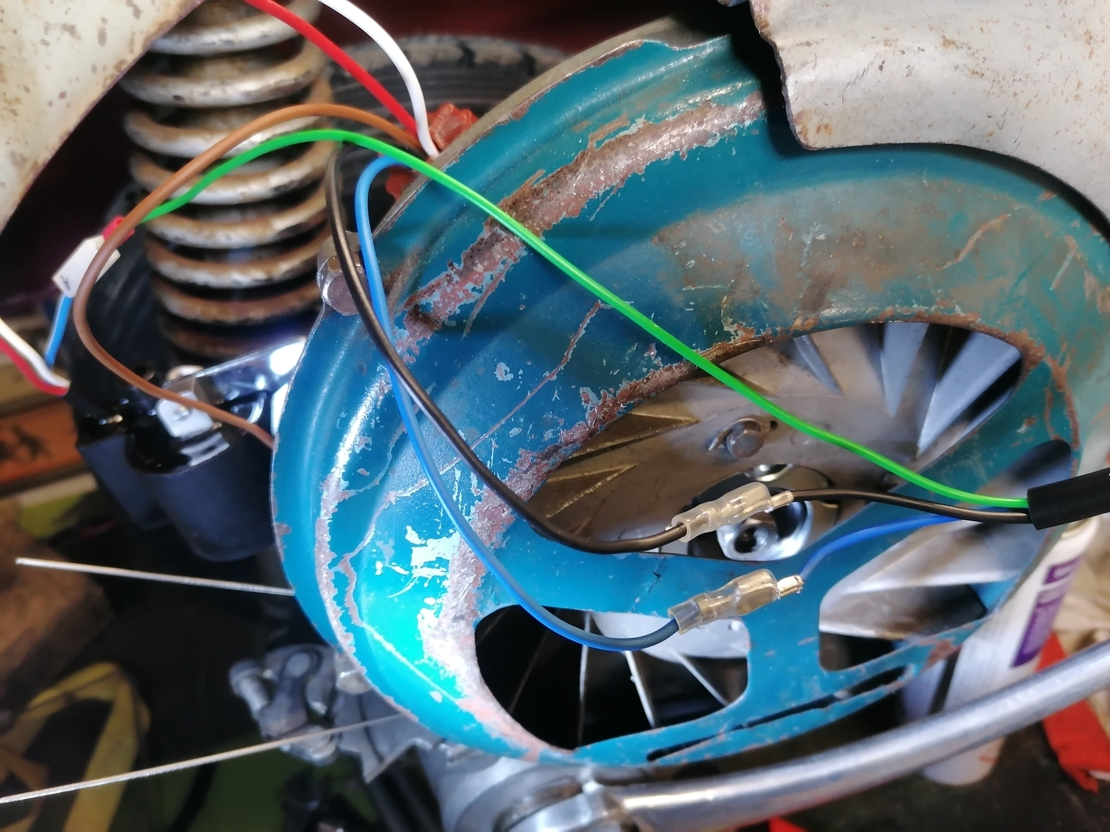 Die Hupe und das Bremslicht bekommen Strom, wenn der Motor läuft, vom blauen Kabel.