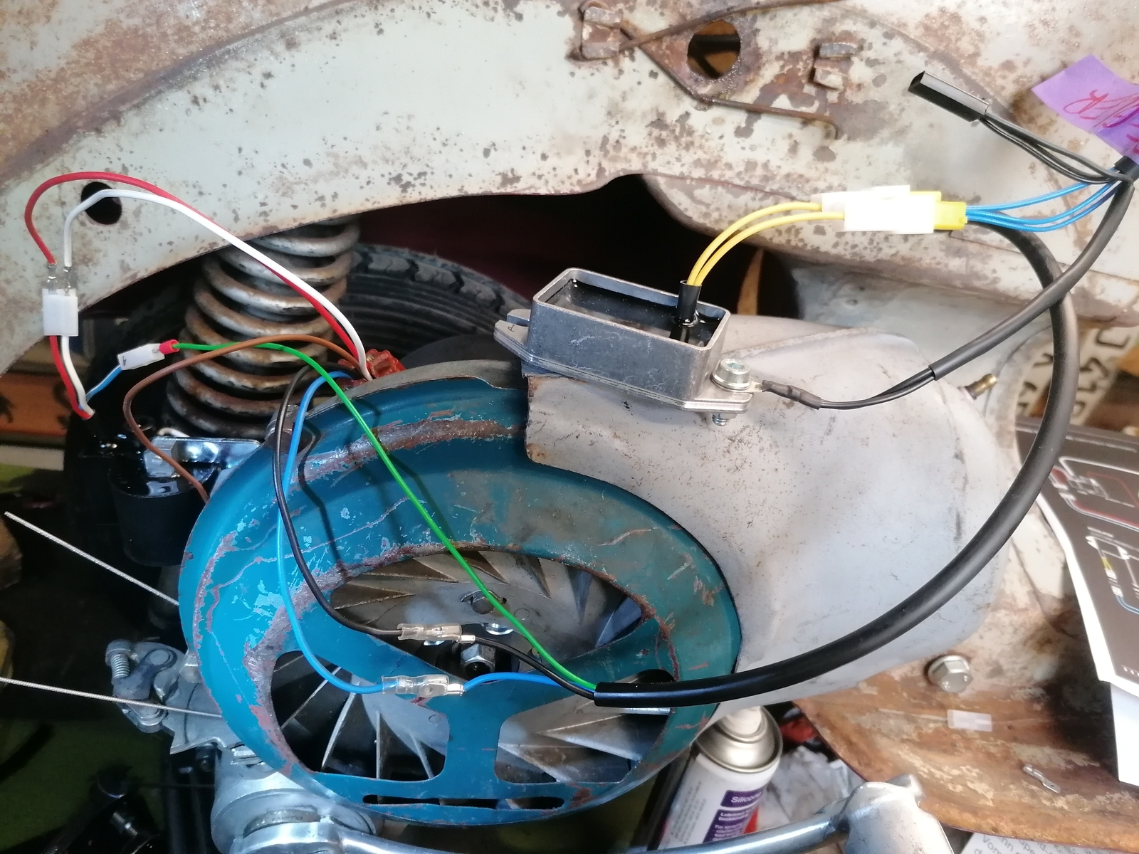 Blau: Strom aus der LiMa zum Regler und vom Regler weiter nach vorne zu Bremslichtschalter, Hupe Eingang des Lichtschalters und Eingang Blinkerrelais