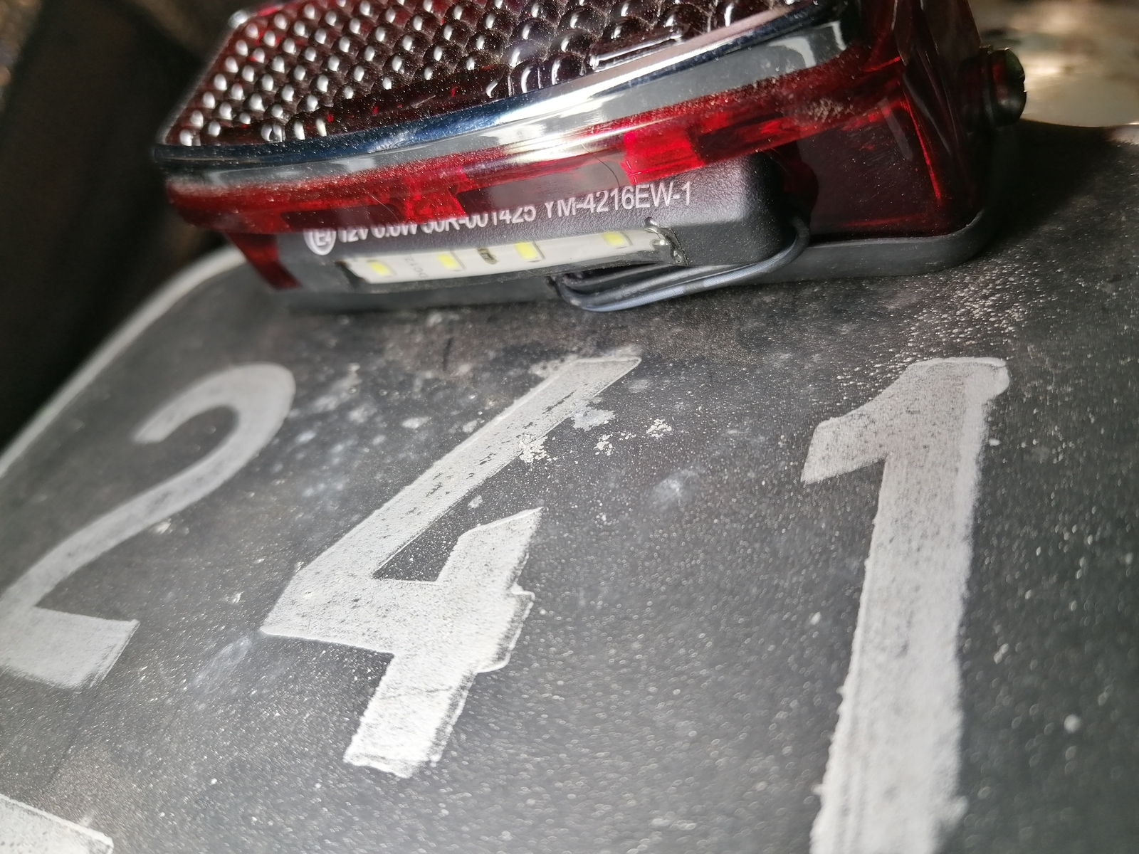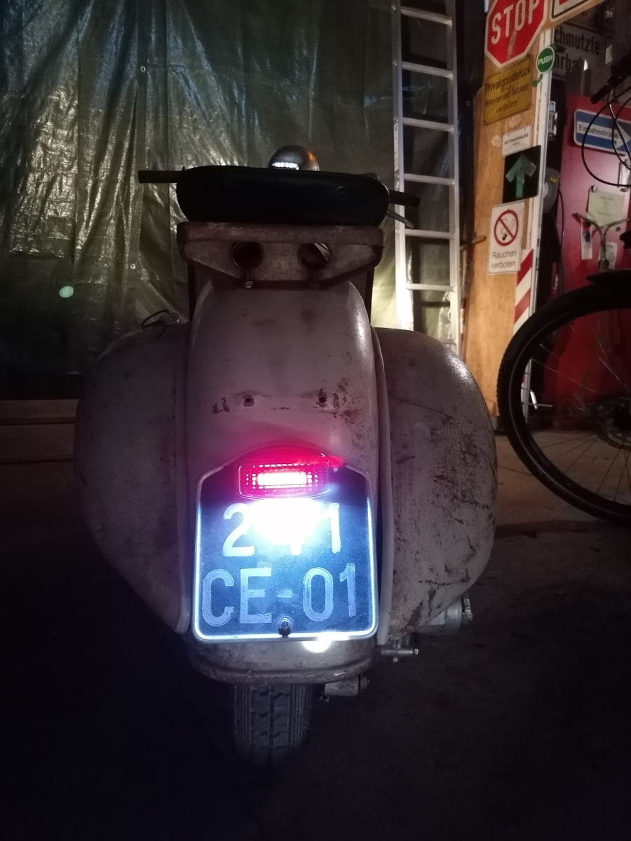 Kennzeichenbeleuchtung,mit E Prüfzeichen,ist auch dran. War eine von den wenigen die sehr flach sind. Nur 6mm hoch. Wollte eigentlich eine mit nur 2 LEDs dram haben. Aber die bauten weiter auf und hätte man nachher von hinten gesehen. Das wollte ich nicht. So versteckt sich die Leuchte hinter den kleinen Überhang vom Rücklichtgehäuse. Hell genug isse auf jeden Fall....