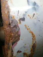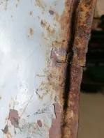 Auf einer Seite. Jetzt sieht man die Risse im Blech ganz gut. Die Beule konnte ich auch etwas richten. Wenn die komplett zerlegt ist werden die Risse geschweißt.