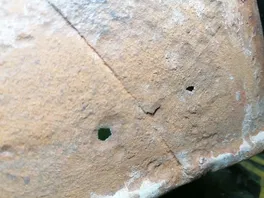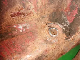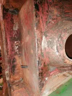 Eine Strebe hat auch ein kleines Rostloch. Hinten am Rahmen bin ich mir nicht mehr sicher ob das größere vordere Rostloch eins ist oder ob da die Backe befestigt ist. Das kleine ist definitiv ein Rostloch.