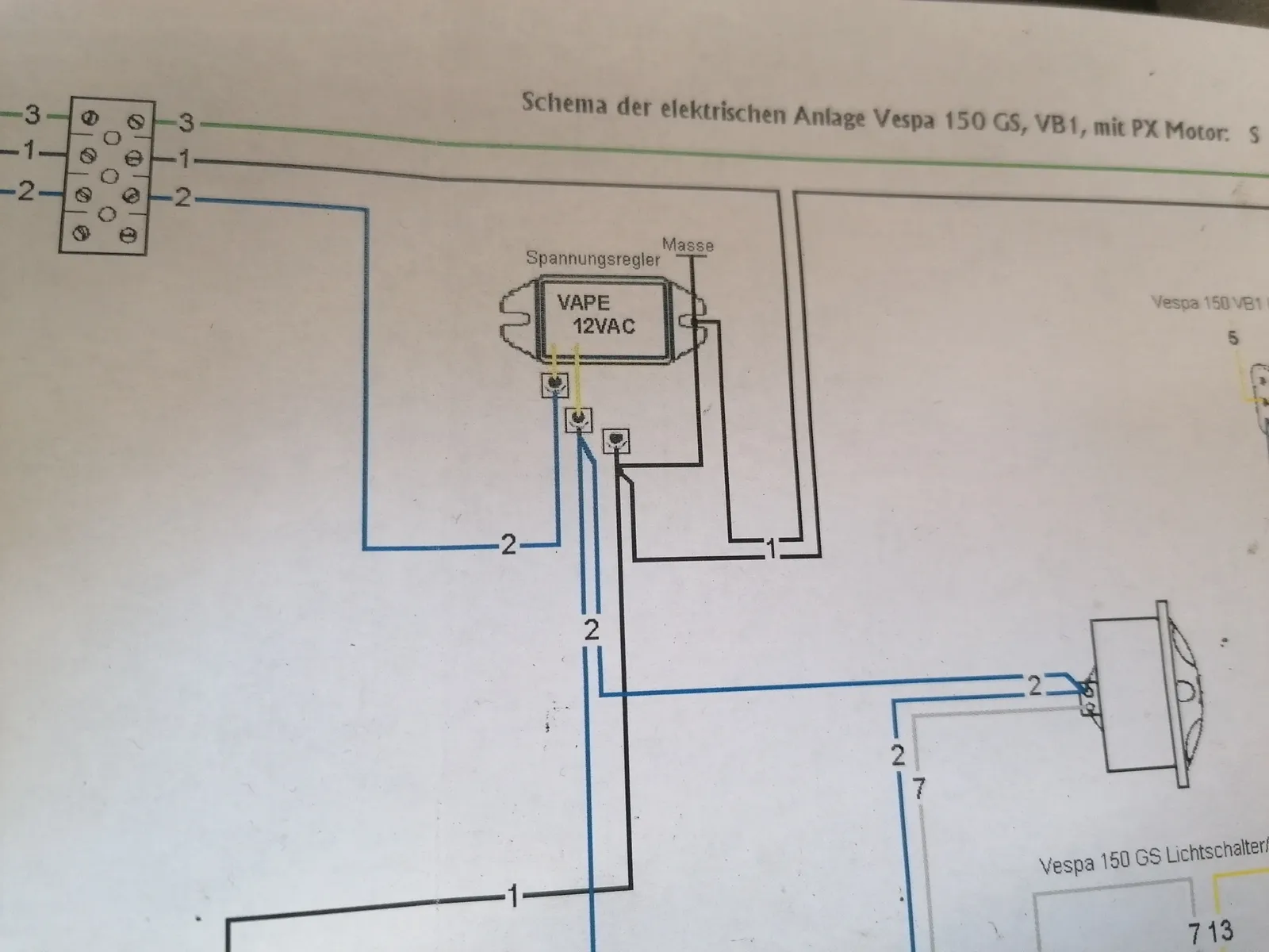 Blau: Strom aus der LiMa zum Regler und vom Regler weiter nach vorne zu Bremslichtschalter, Hupe Eingang des Lichtschalters und Eingang Blinkerrelais