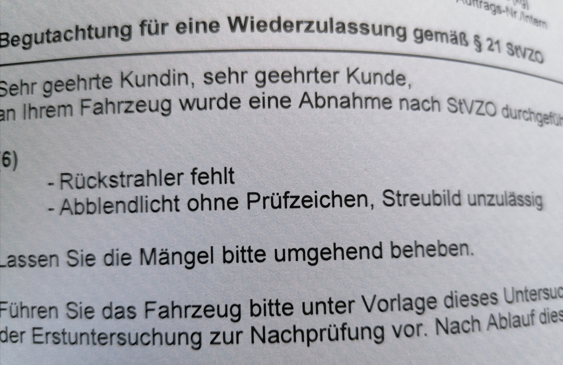 Ich war heute zur 21er Abnahme. Leider nicht bestanden. Den Rückstrahler habe ich total verpennt.