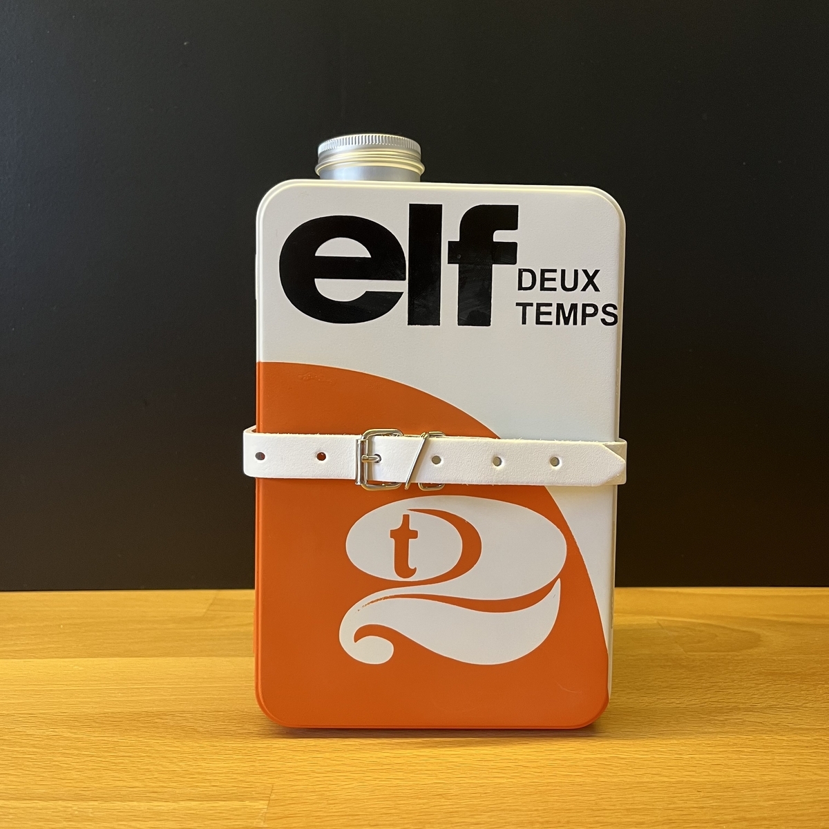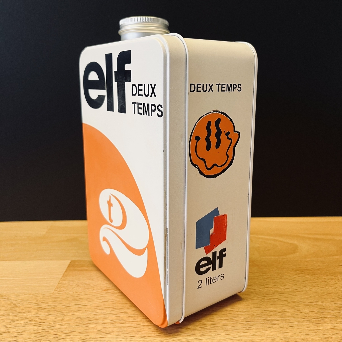 Als Basis dient eine Weißblechdose, welche von der Größe sehr ähnlich zur originalen Öldose ist. Alles von Hand lackiert. KEINE STICKER, alles Lack. Lässt sich somit super patinieren (siehe Smilie und Elf Logo - jedoch nur minimal Patina aktuell).
