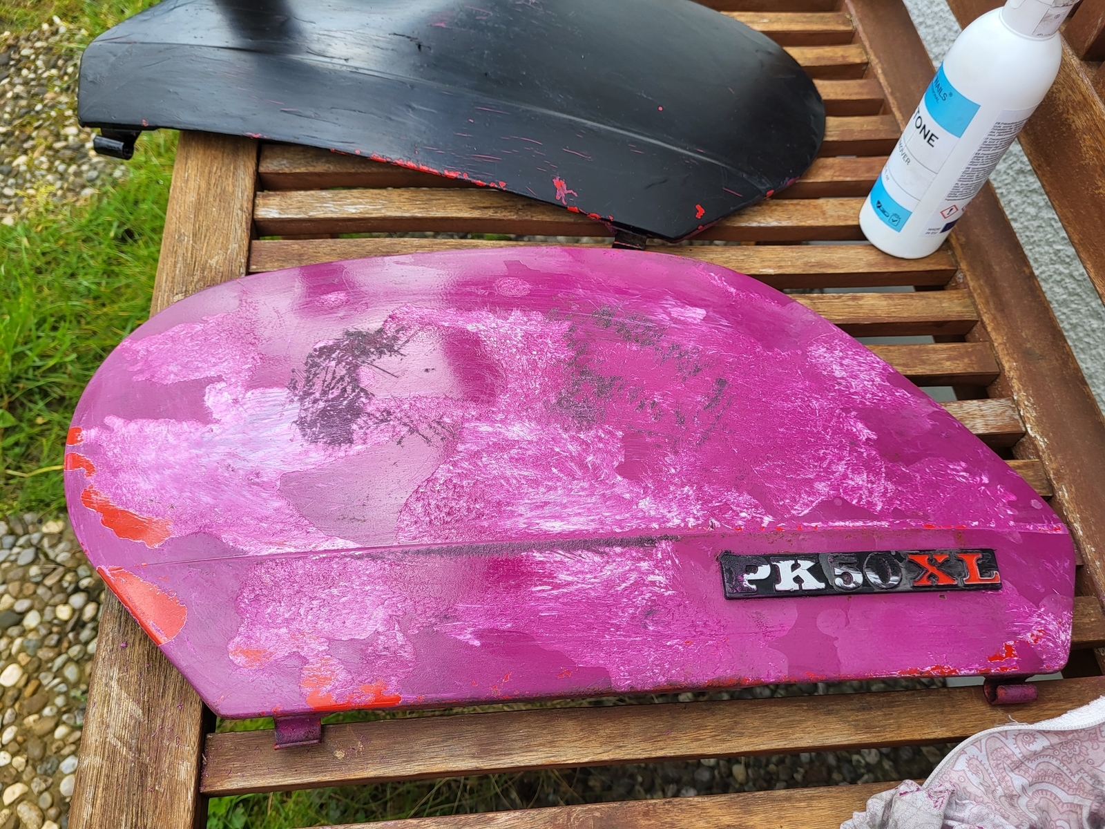 • Ich würde den Kotflügel teilweise pink lassen. Wenn da eh kein originaler Lack drunter ist. Dann haste immerhin etwas alten ranzigen Lack da. Finde die Klasse 2-)