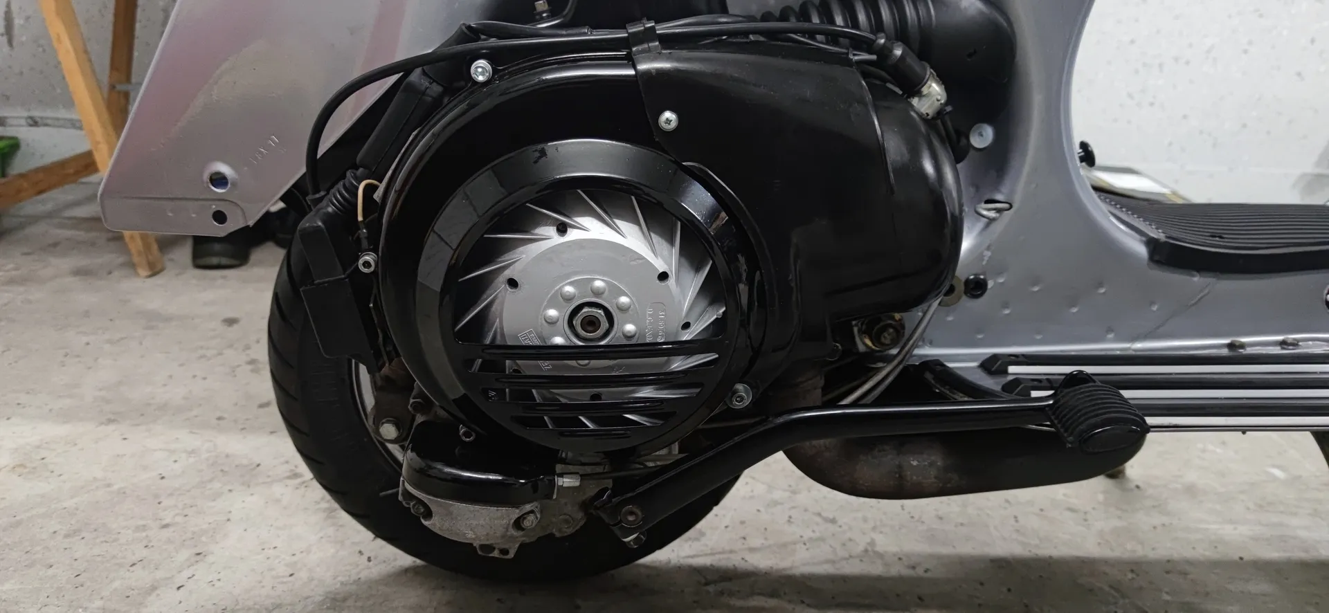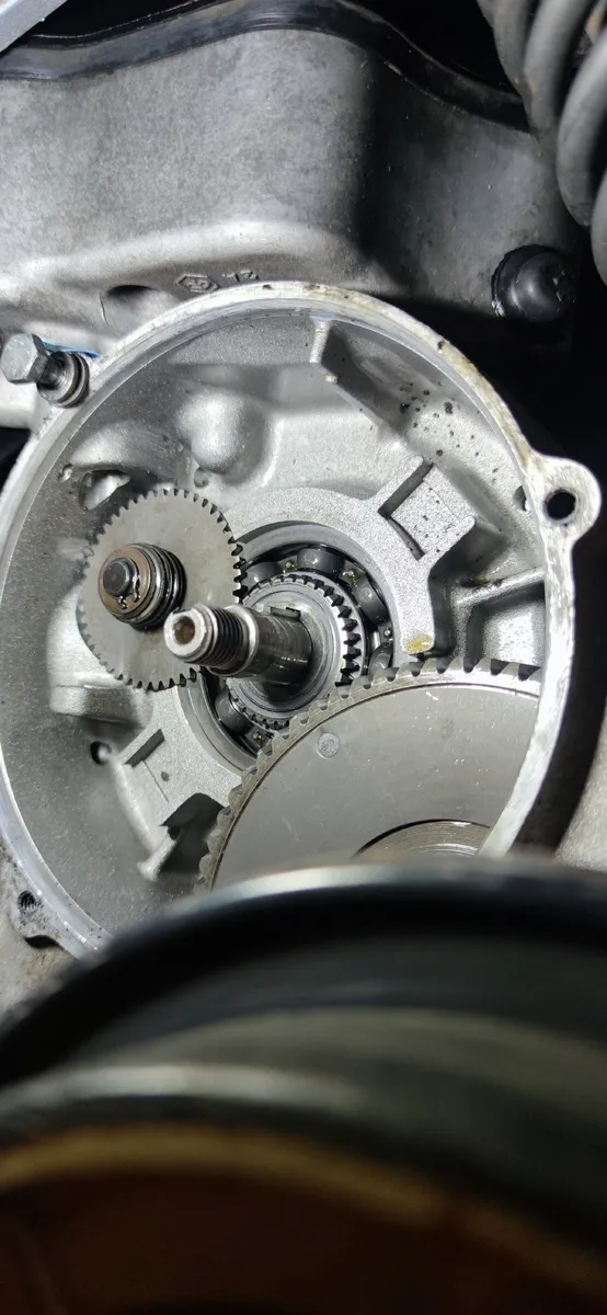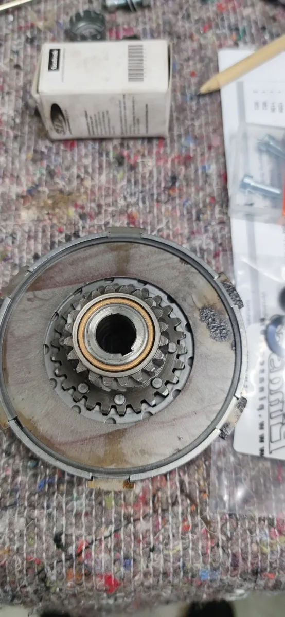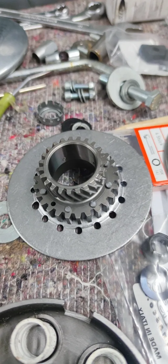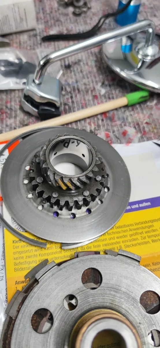 Habe nun endlich nachdem ich die Spezial Nuß für die Kronenmutter vom Kumpel geholt habe, die Kupplung ausbauen können um das 20er Kupplungsritzel gegen das 23er von DRT zu tauschen.