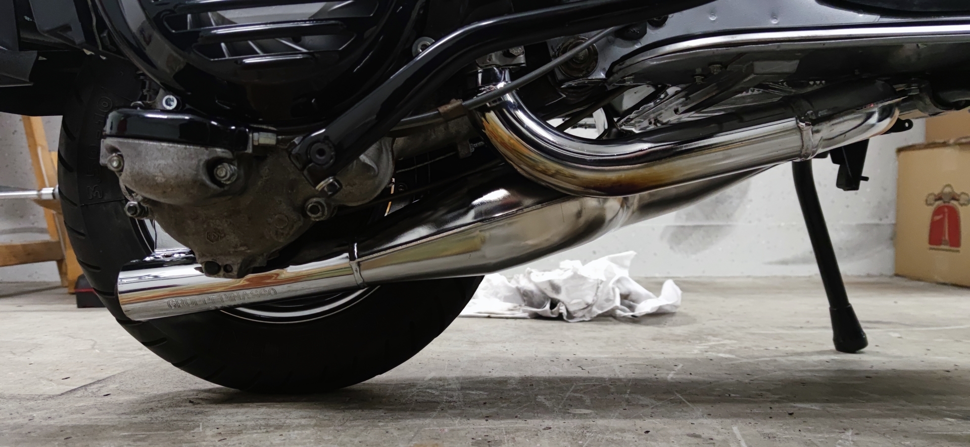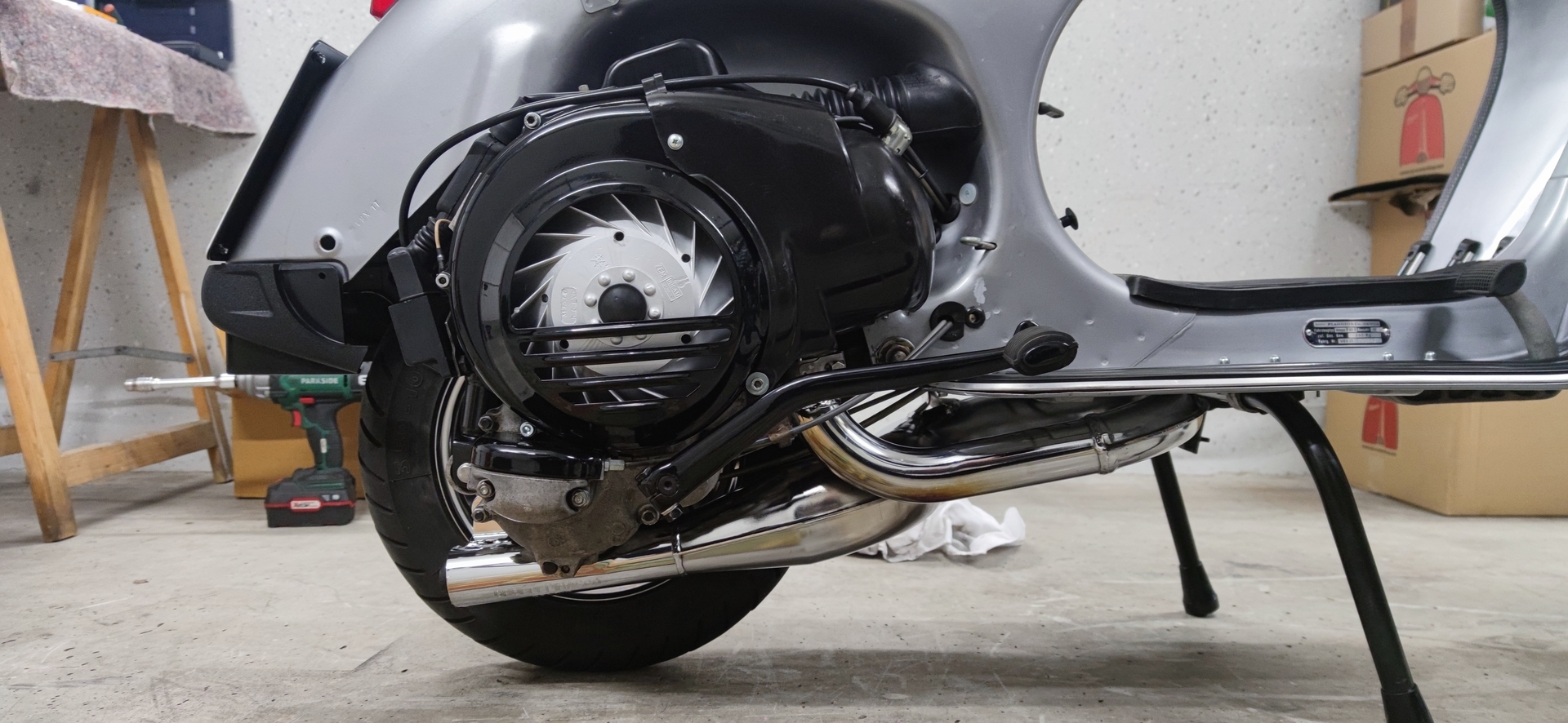 Heute habe ich meinen gebrauchten Pinasco right hand Auspuff bekommen. Habe den aufpoliert, nun schaut er aus wie neu. Mal schauen wie sie sich damit fährt. Meint ihr ich sollte die 102er HD um eine größere ersetzen? Aber seht selbst.