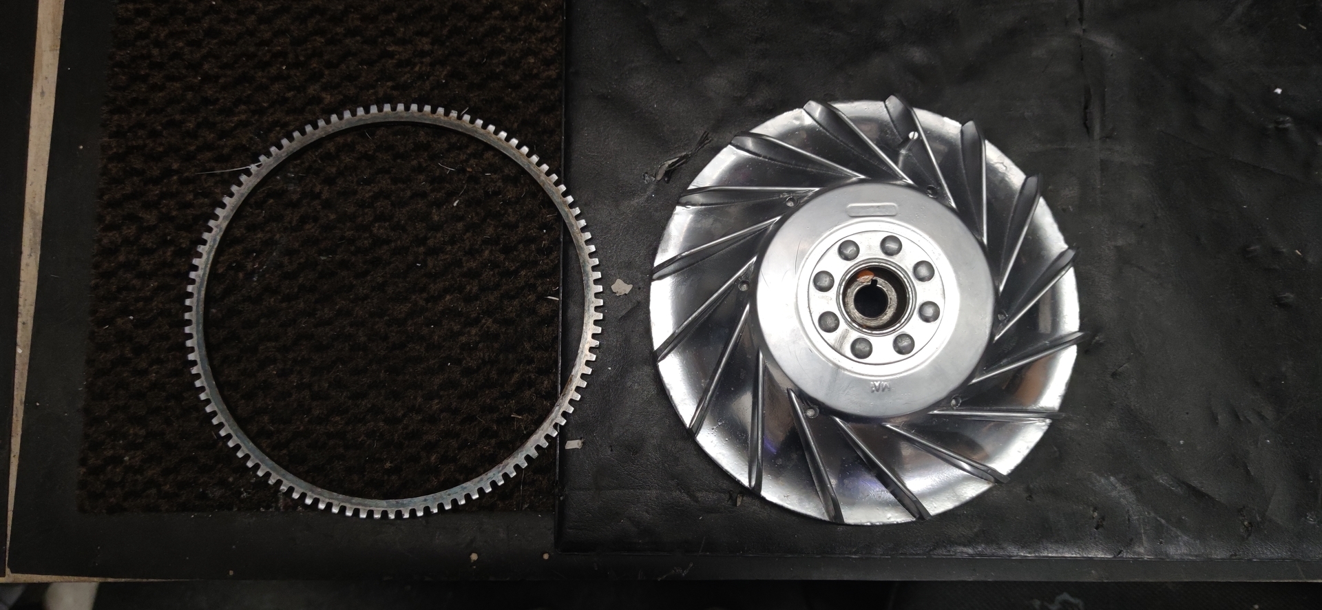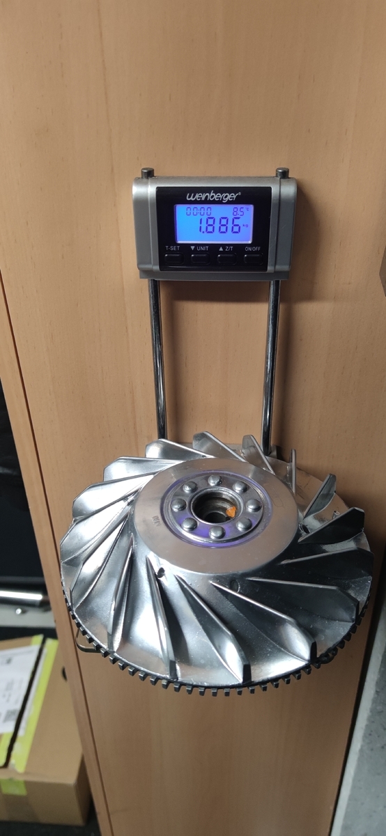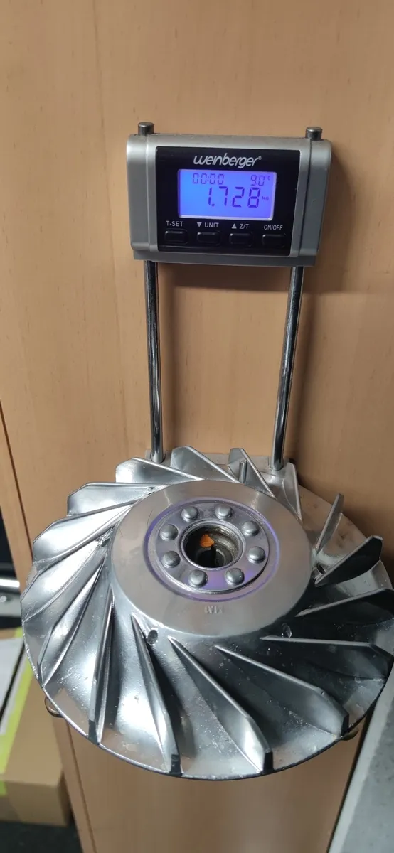 Habe jetzt ein leichtes Lüfterrad montiert. Habe eins bei Kleinanzeigen geschossen, eins von SIP mit Elestartkranz und 1.900 Gramm. Habe dann den Kranz runtergekloppt und den Steg wo der Kranz drum saß abgedreht. Hätte sonst nicht gepasst, da der Steg dann am Gehäuse geschliffen wäre.