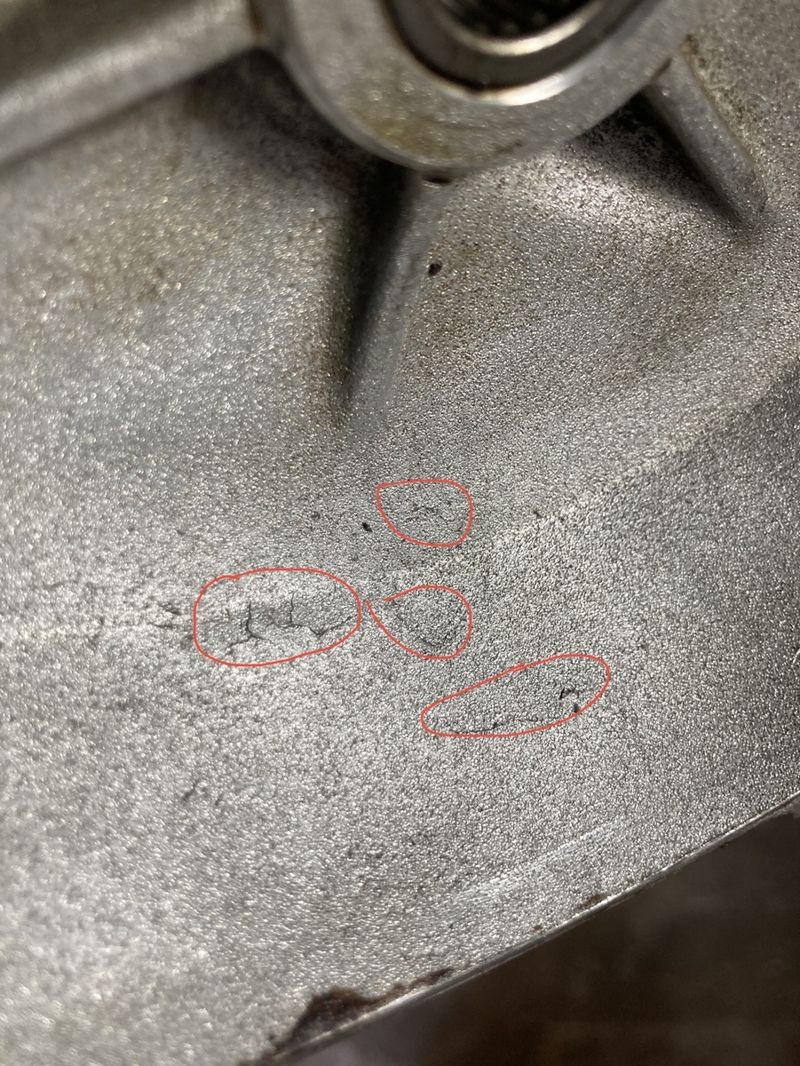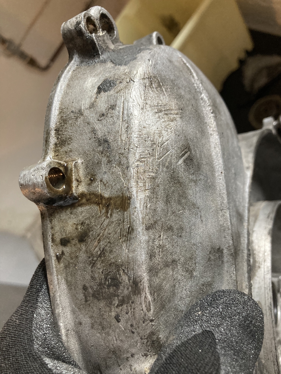 2. Der Vorbesitzer ist offentsichtlich einige Male aufgesetzt (siehe Foto), dabei haben sich Risse im Motorgehäuse gebildet (siehe Rote Umkreisungen). Vor der Revision tropfte dennoch kein Öl aus den Schrammen. Trotzdem möchte ich diese Risse beseitigen. Ich frage mich allerdings, ob die Defekte nicht schon zu groß fürs Schweißen sind und ein neues Gehäuse her muss.