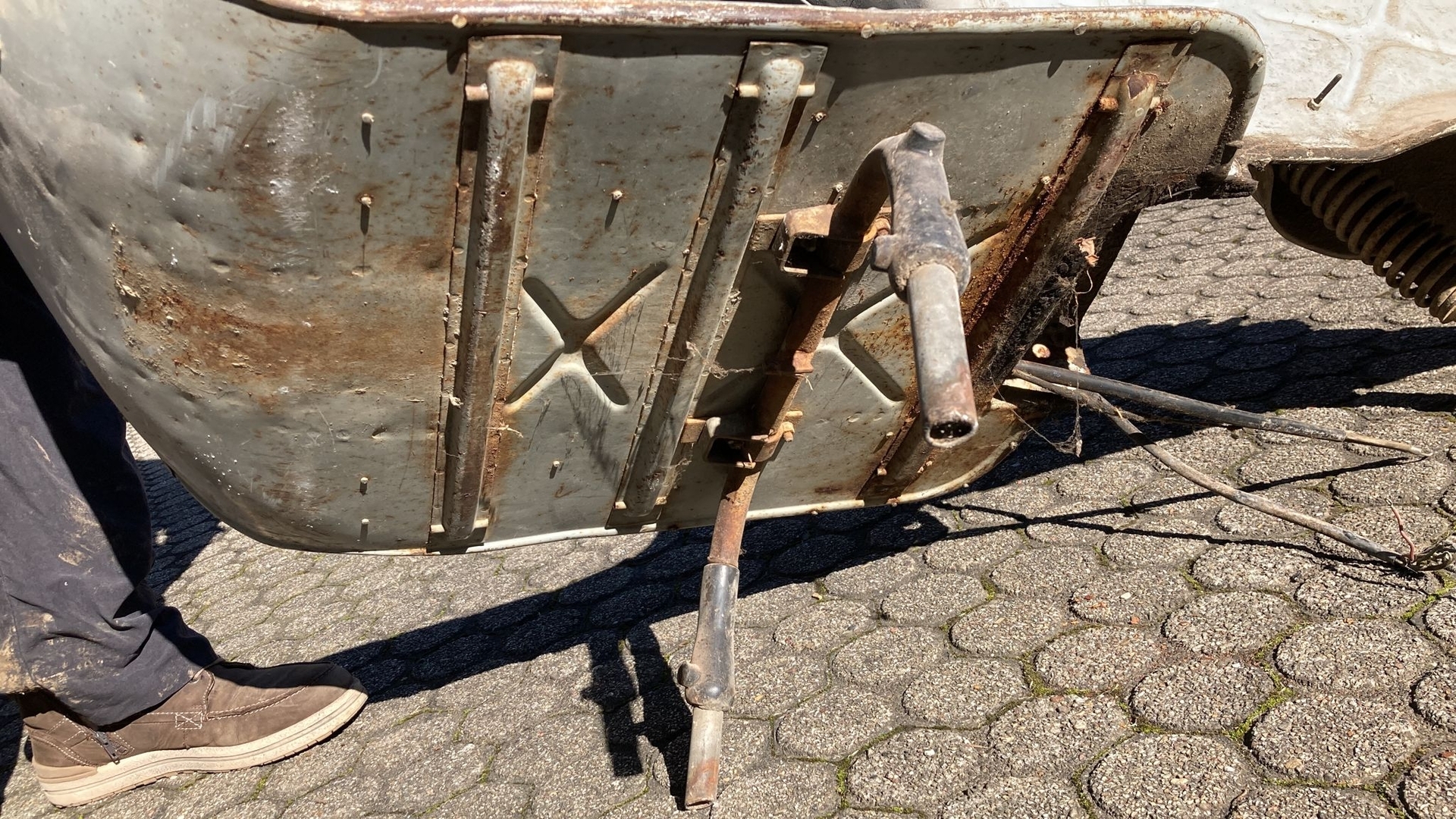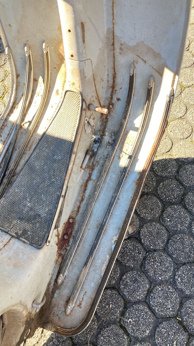 Der Rahmen ist nicht durchrostet, hat aber im Blechtunnel und an ein paar Stellen außen, Rost angesetzt. Wir möchten gerne die Patina der Vespa konservieren, also nicht alles runter holen, Sandstrahlen und neu lackieren. Die Vespa hat viel erlebt, was man ihr auch ansieht (Schrammen, Kratzer, Dellen). Das Beinschild ist etwas verbogen, das sollte denke ich gemacht werden.