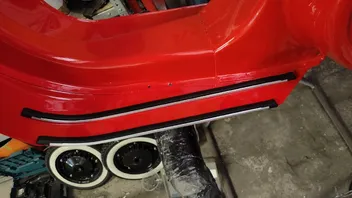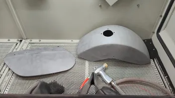 Als erstes habe ich die Vespa dann komplett zerlegt, einige kleine Stellen geschweißt, die Löcher für die Gummimatte "gecleant" und den Rahmen teilweilse Sandstrahlen lassen. Die Anbauteile konnte ich Glücklicherweise selber Strahlen, anschließend Rahmen, Schutzblech und Backen ausgebeult (Richtig geiles Blech, auf dem Roller ist fast kein Spachtel), Trittleisten angepasst und alles in Marsrot lackieren lassen.