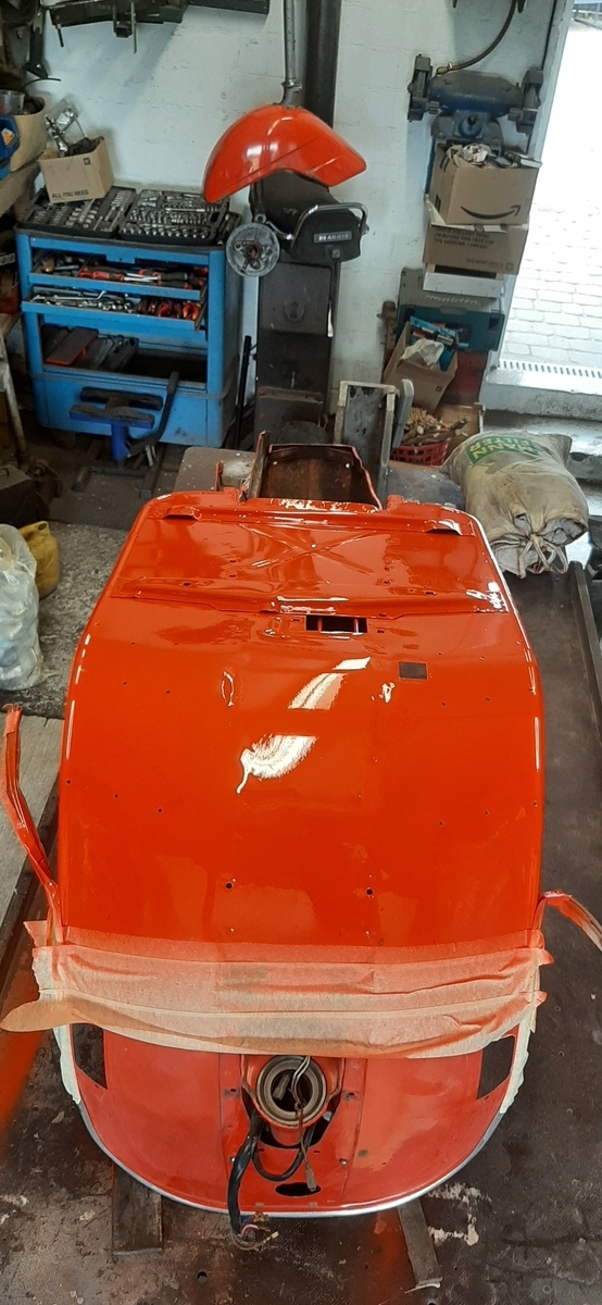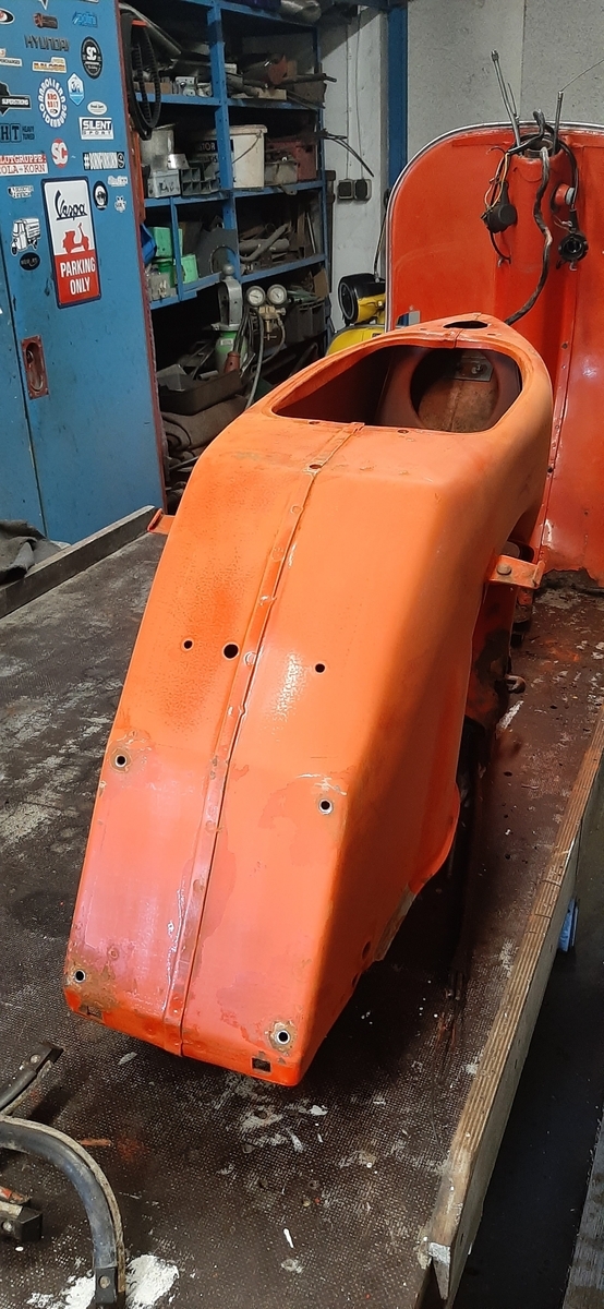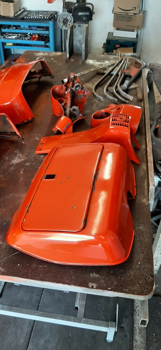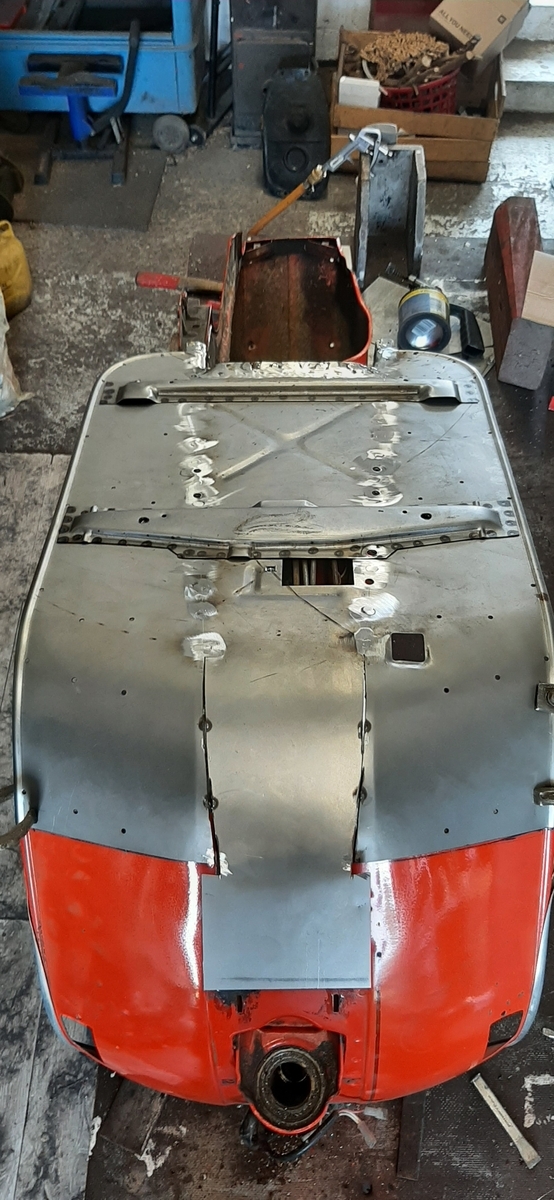 Die neu eingesetzten Teile wie das Bodenblech und der untere Bereich des Rahmens wurden dann in Rosso 621 lackiert.