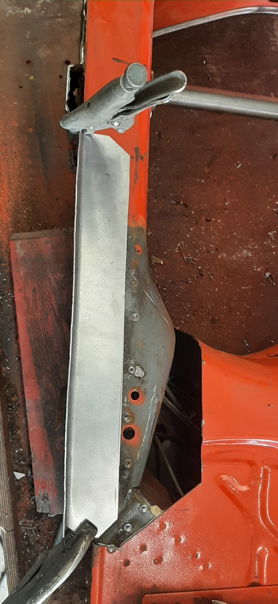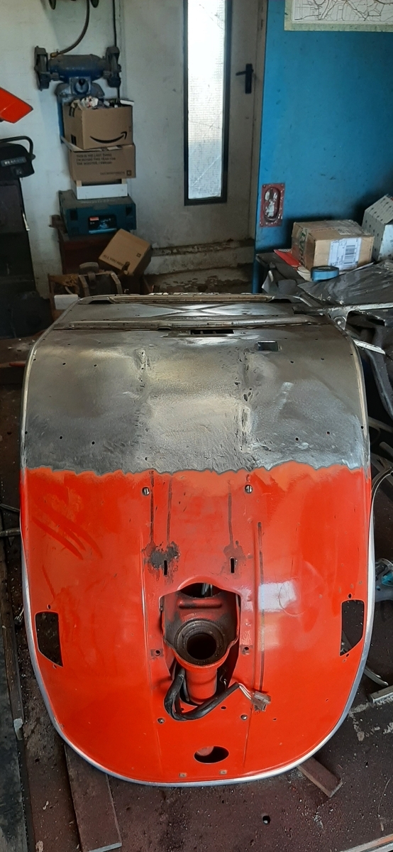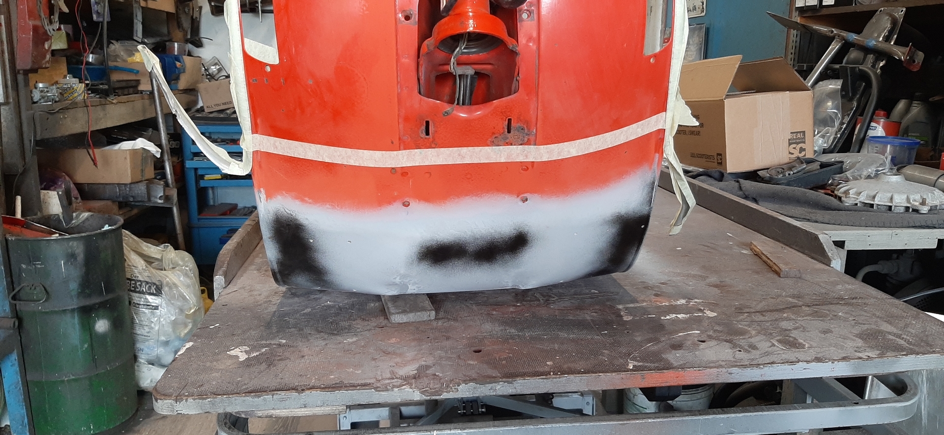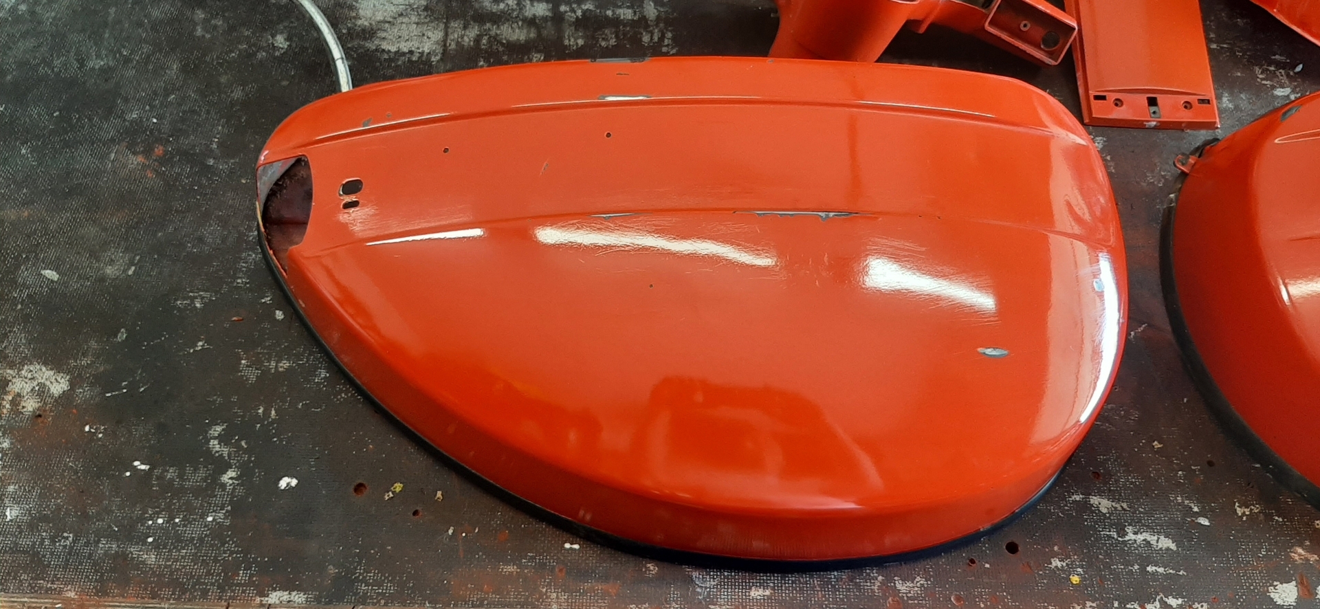 Die neu eingesetzten Teile wie das Bodenblech und der untere Bereich des Rahmens wurden dann in Rosso 621 lackiert.