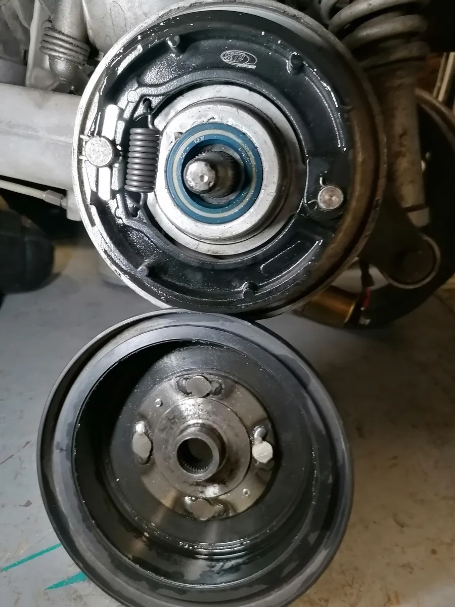 Falls ja, mach mal bitte Rad und Bremstrommel ab. Findet sich Öl in der Bremse dürfte der Simmerring ein Problem haben / machen.