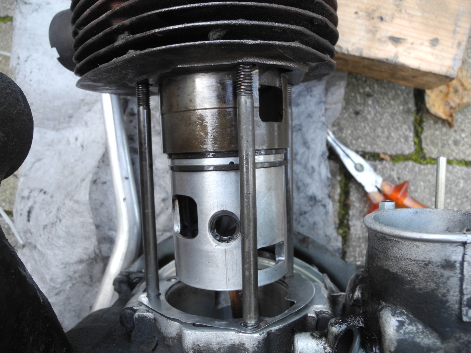 Die Fußdichtung kannst du noch zu den Gehäuse-Überstömern nachschneiden! Und pass auf, das die K-Ringe richtig an der Kolbennut anliegen! Und lege bitte einen Lappen unter den Kolben bis die Ringe richtig im Zylinder sitzen =O !